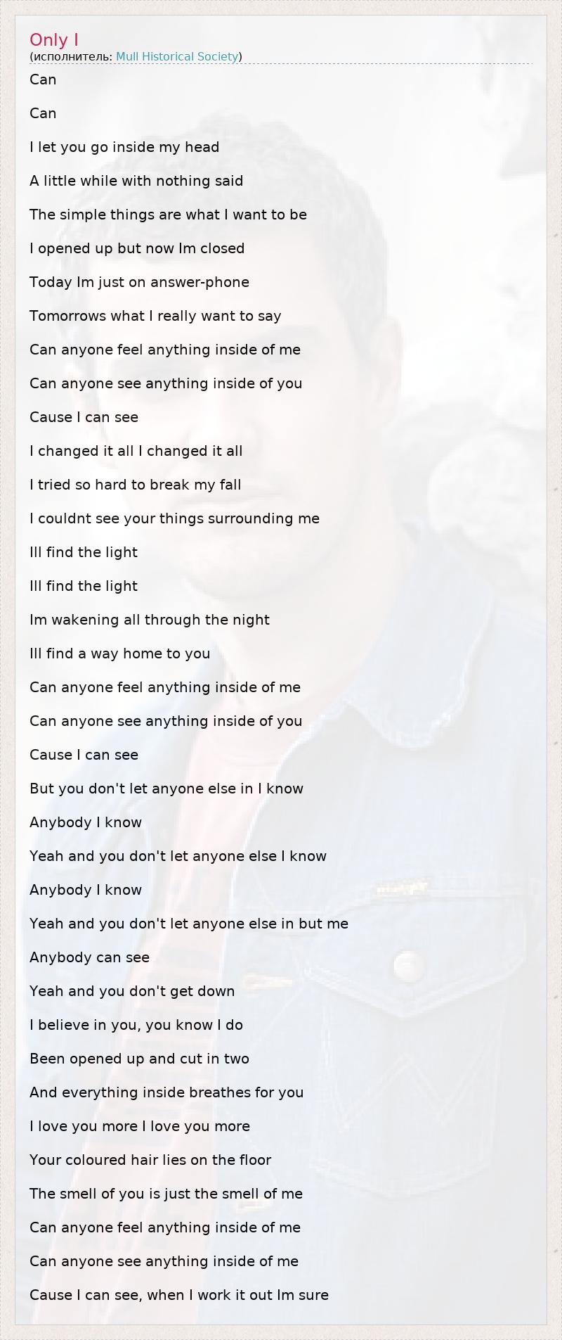 Can Can I let you go inside my head A little while with nothing said The simple things are what I want to be I opened up but now Im closed Today Im just on answer-phone Tomorrows what I really want to say Can anyone feel anything inside of me Can anyone see anything inside of you Cause I can see I changed it all I changed it all I tried so hard to break my fall I couldnt see your things surrounding me Ill find the light Ill find the light Im wakening all through the night Ill find a way home to you Can anyone feel anything inside of me Can anyone see anything inside of you Cause I can see But you don't let anyone else in I know Anybody I know Yeah and you don't let anyone else I know Anybody I know Yeah and you don't let anyone else in but me Anybody can see Yeah and you don't get down I believe in you, you know I do Been opened up and cut in two And everything inside breathes for you I love you more I love you more Your coloured hair lies on the floor The smell of you is just the smell of me Can anyone feel anything inside of me Can anyone see anything inside of me Cause I can see, when I work it out Im sure