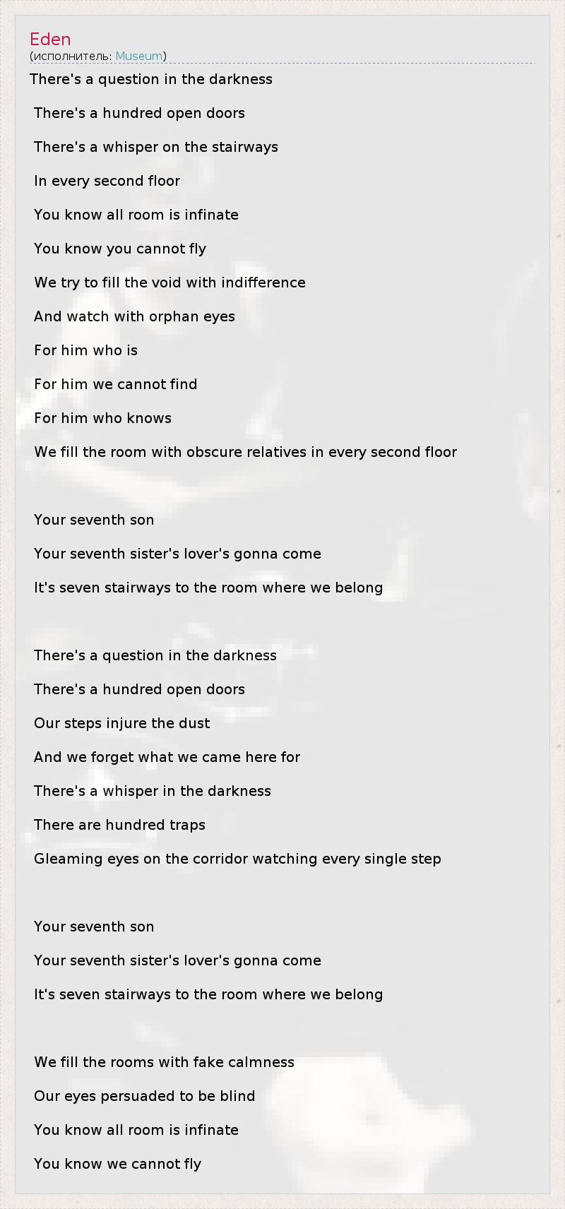 There's a question in the darkness There's a hundred open doors There's a whisper on the stairways In every second floor You know all room is infinate You know you cannot fly We try to fill the void with indifference And watch with orphan eyes For him who is For him we cannot find For him who knows We fill the room with obscure relatives in every second floor Your seventh son Your seventh sister's lover's gonna come It's seven stairways to the room where we belong There's a question in the darkness There's a hundred open doors Our steps injure the dust And we forget what we came here for There's a whisper in the darkness There are hundred traps Gleaming eyes on the corridor watching every single step Your seventh son Your seventh sister's lover's gonna come It's seven stairways to the room where we belong We fill the rooms with fake calmness Our eyes persuaded to be blind You know all room is infinate You know we cannot fly