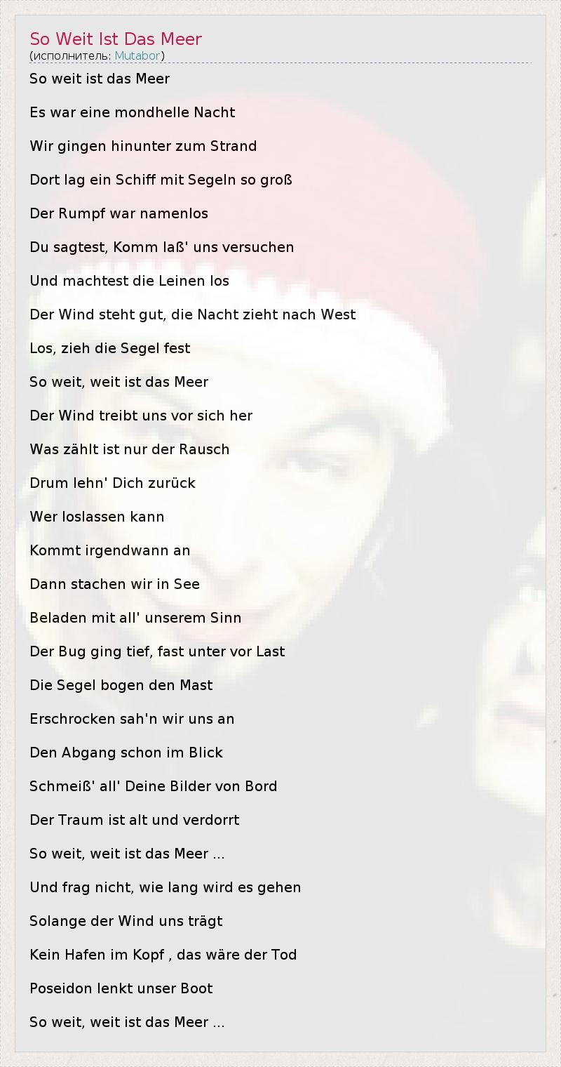 So weit ist das Meer Es war eine mondhelle Nacht Wir gingen hinunter zum Strand Dort lag ein Schiff mit Segeln so groß Der Rumpf war namenlos Du sagtest, Komm laß' uns versuchen Und machtest die Leinen los Der Wind steht gut, die Nacht zieht nach West Los, zieh die Segel fest So weit, weit ist das Meer Der Wind treibt uns vor sich her Was zählt ist nur der Rausch Drum lehn' Dich zurück Wer loslassen kann Kommt irgendwann an Dann stachen wir in See Beladen mit all' unserem Sinn Der Bug ging tief, fast unter vor Last Die Segel bogen den Mast Erschrocken sah'n wir uns an Den Abgang schon im Blick Schmeiß' all' Deine Bilder von Bord Der Traum ist alt und verdorrt So weit, weit ist das Meer ... Und frag nicht, wie lang wird es gehen Solange der Wind uns trägt Kein Hafen im Kopf , das wäre der Tod Poseidon lenkt unser Boot So weit, weit ist das Meer ...