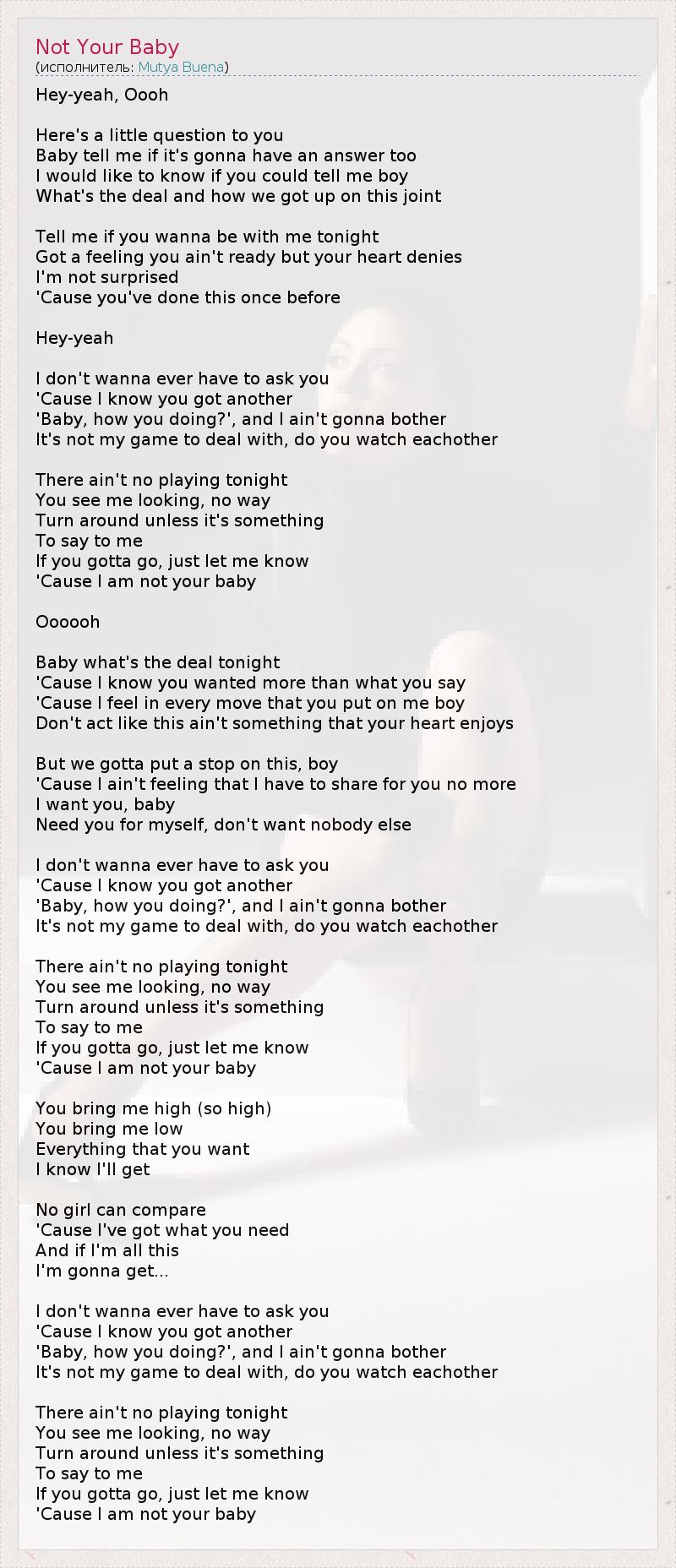 Hey-yeah, Oooh Here's a little question to you Baby tell me if it's gonna have an answer too I would like to know if you could tell me boy What's the deal and how we got up on this joint Tell me if you wanna be with me tonight Got a feeling you ain't ready but your heart denies I'm not surprised 'Cause you've done this once before Hey-yeah I don't wanna ever have to ask you 'Cause I know you got another 'Baby, how you doing?', and I ain't gonna bother It's not my game to deal with, do you watch eachother There ain't no playing tonight You see me looking, no way Turn around unless it's something To say to me If you gotta go, just let me know 'Cause I am not your baby Oooooh Baby what's the deal tonight 'Cause I know you wanted more than what you say 'Cause I feel in every move that you put on me boy Don't act like this ain't something that your heart enjoys But we gotta put a stop on this, boy 'Cause I ain't feeling that I have to share for you no more I want you, baby Need you for myself, don't want nobody else I don't wanna ever have to ask you 'Cause I know you got another 'Baby, how you doing?', and I ain't gonna bother It's not my game to deal with, do you watch eachother There ain't no playing tonight You see me looking, no way Turn around unless it's something To say to me If you gotta go, just let me know 'Cause I am not your baby You bring me high (so high) You bring me low Everything that you want I know I'll get No girl can compare 'Cause I've got what you need And if I'm all this I'm gonna get... I don't wanna ever have to ask you 'Cause I know you got another 'Baby, how you doing?', and I ain't gonna bother It's not my game to deal with, do you watch eachother There ain't no playing tonight You see me looking, no way Turn around unless it's something To say to me If you gotta go, just let me know 'Cause I am not your baby