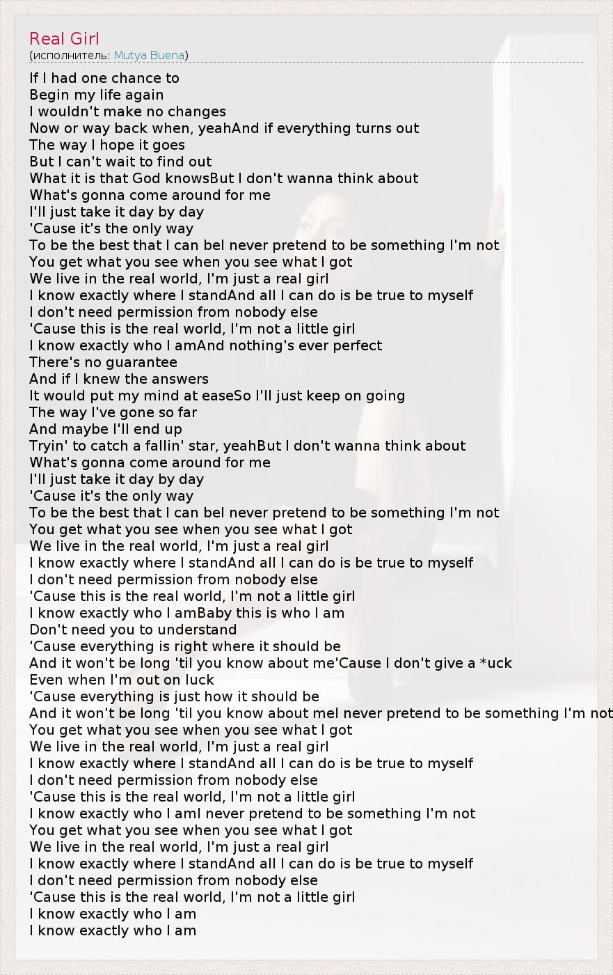 If I had one chance to Begin my life again I wouldn't make no changes Now or way back when, yeahAnd if everything turns out The way I hope it goes But I can't wait to find out What it is that God knowsBut I don't wanna think about What's gonna come around for me I'll just take it day by day 'Cause it's the only way To be the best that I can beI never pretend to be something I'm not You get what you see when you see what I got We live in the real world, I'm just a real girl I know exactly where I standAnd all I can do is be true to myself I don't need permission from nobody else 'Cause this is the real world, I'm not a little girl I know exactly who I amAnd nothing's ever perfect There's no guarantee And if I knew the answers It would put my mind at easeSo I'll just keep on going The way I've gone so far And maybe I'll end up Tryin' to catch a fallin' star, yeahBut I don't wanna think about What's gonna come around for me I'll just take it day by day 'Cause it's the only way To be the best that I can beI never pretend to be something I'm not You get what you see when you see what I got We live in the real world, I'm just a real girl I know exactly where I standAnd all I can do is be true to myself I don't need permission from nobody else 'Cause this is the real world, I'm not a little girl I know exactly who I amBaby this is who I am Don't need you to understand 'Cause everything is right where it should be And it won't be long 'til you know about me'Cause I don't give a *uck Even when I'm out on luck 'Cause everything is just how it should be And it won't be long 'til you know about meI never pretend to be something I'm not You get what you see when you see what I got We live in the real world, I'm just a real girl I know exactly where I standAnd all I can do is be true to myself I don't need permission from nobody else 'Cause this is the real world, I'm not a little girl I know exactly who I amI never pretend to be something I'm not You get what you see when you see what I got We live in the real world, I'm just a real girl I know exactly where I standAnd all I can do is be true to myself I don't need permission from nobody else 'Cause this is the real world, I'm not a little girl I know exactly who I am I know exactly who I am