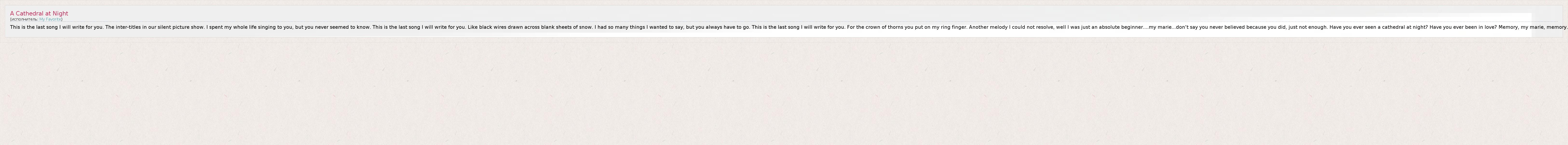 This is the last song I will write for you. The inter-titles in our silent picture show. I spent my whole life singing to you, but you never seemed to know. This is the last song I will write for you. Like black wires drawn across blank sheets of snow. I had so many things I wanted to say, but you always have to go. This is the last song I will write for you. For the crown of thorns you put on my ring finger. Another melody I could not resolve, well I was just an absolute beginner....my marie...don't say you never believed because you did, just not enough. Have you ever seen a cathedral at night? Have you ever been in love? Memory, my marie, memory.