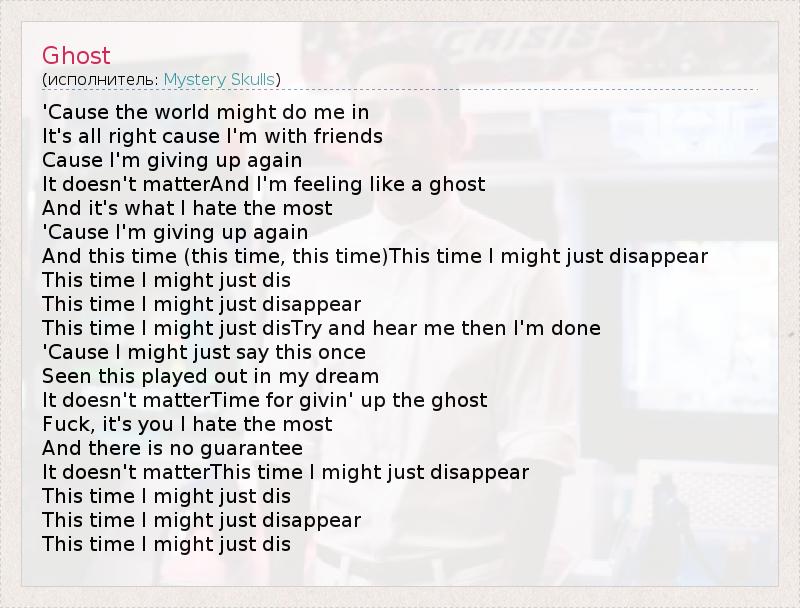 'Cause the world might do me in It's all right cause I'm with friends Cause I'm giving up again It doesn't matterAnd I'm feeling like a ghost And it's what I hate the most 'Cause I'm giving up again And this time (this time, this time)This time I might just disappear This time I might just dis This time I might just disappear This time I might just disTry and hear me then I'm done 'Cause I might just say this once Seen this played out in my dream It doesn't matterTime for givin' up the ghost Fuck, it's you I hate the most And there is no guarantee It doesn't matterThis time I might just disappear This time I might just dis This time I might just disappear This time I might just dis