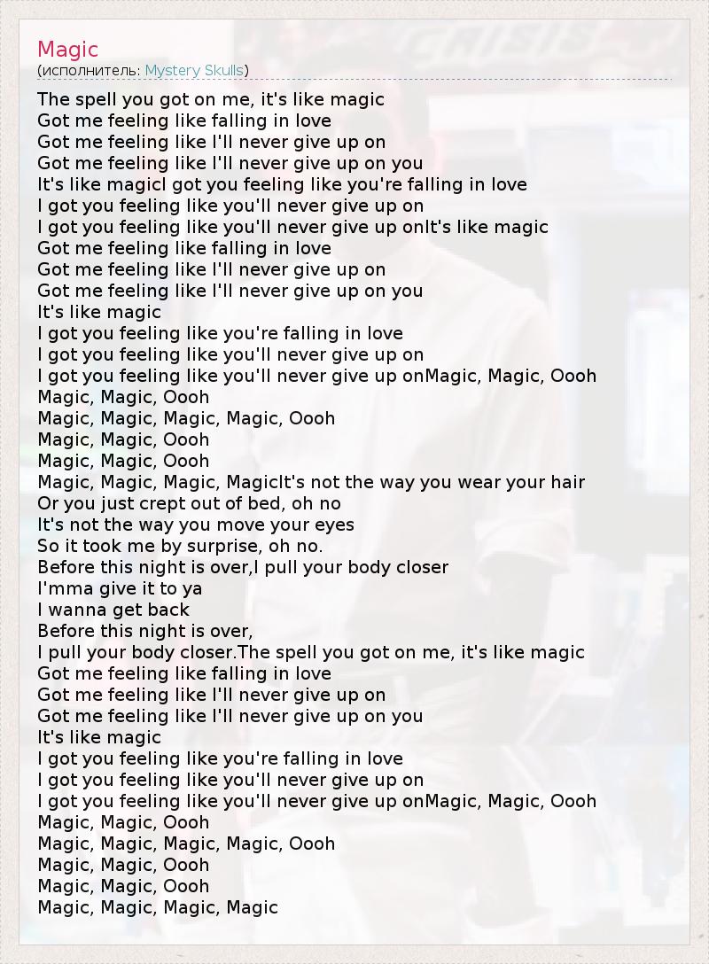 The spell you got on me, it's like magic Got me feeling like falling in love Got me feeling like I'll never give up on Got me feeling like I'll never give up on you It's like magicI got you feeling like you're falling in love I got you feeling like you'll never give up on I got you feeling like you'll never give up onIt's like magic Got me feeling like falling in love Got me feeling like I'll never give up on Got me feeling like I'll never give up on you It's like magic I got you feeling like you're falling in love I got you feeling like you'll never give up on I got you feeling like you'll never give up onMagic, Magic, Oooh Magic, Magic, Oooh Magic, Magic, Magic, Magic, Oooh Magic, Magic, Oooh Magic, Magic, Oooh Magic, Magic, Magic, MagicIt's not the way you wear your hair Or you just crept out of bed, oh no It's not the way you move your eyes So it took me by surprise, oh no. Before this night is over,I pull your body closer I'mma give it to ya I wanna get back Before this night is over, I pull your body closer.The spell you got on me, it's like magic Got me feeling like falling in love Got me feeling like I'll never give up on Got me feeling like I'll never give up on you It's like magic I got you feeling like you're falling in love I got you feeling like you'll never give up on I got you feeling like you'll never give up onMagic, Magic, Oooh Magic, Magic, Oooh Magic, Magic, Magic, Magic, Oooh Magic, Magic, Oooh Magic, Magic, Oooh Magic, Magic, Magic, Magic
