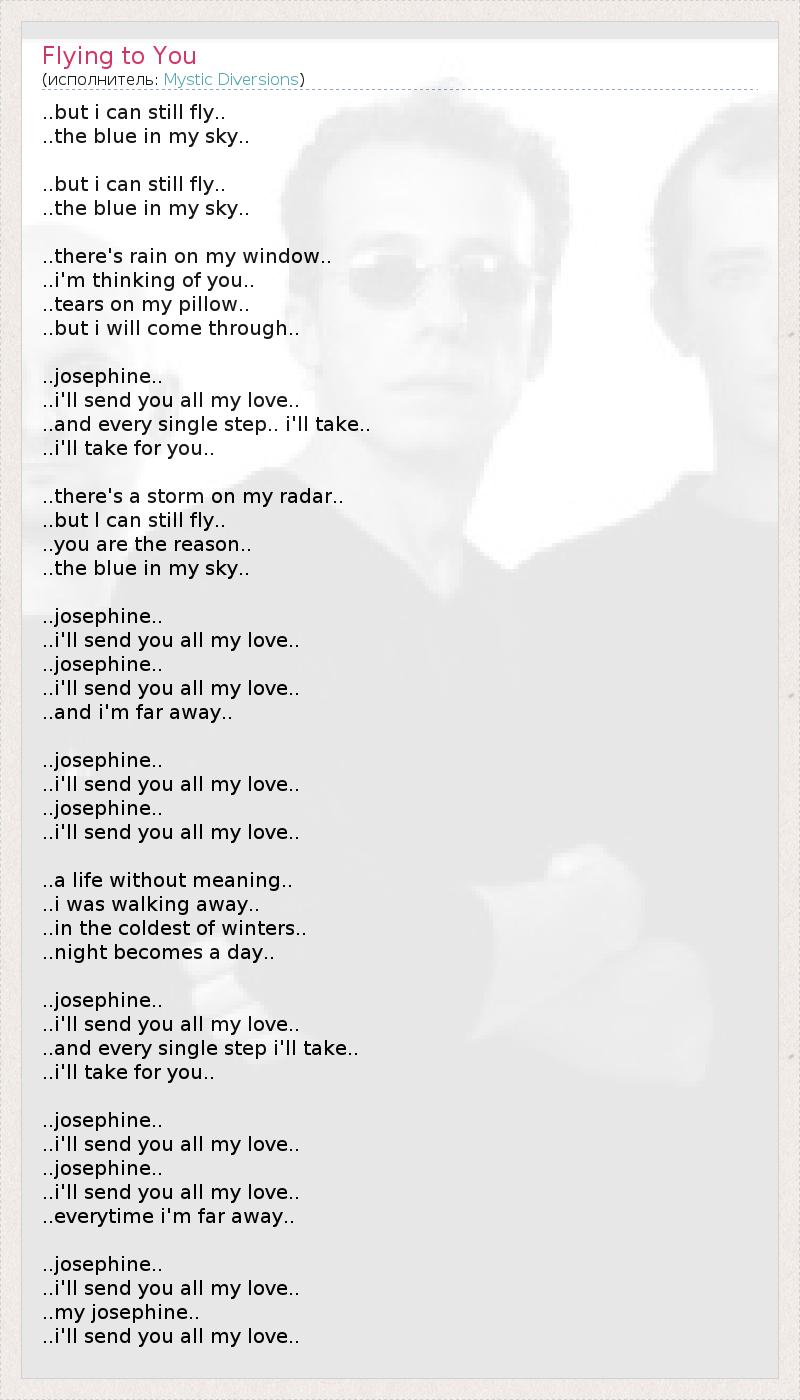 ..but i can still fly.. ..the blue in my sky.. ..but i can still fly.. ..the blue in my sky.. ..there's rain on my window.. ..i'm thinking of you.. ..tears on my pillow.. ..but i will come through.. ..josephine.. ..i'll send you all my love.. ..and every single step.. i'll take.. ..i'll take for you.. ..there's a storm on my radar.. ..but I can still fly.. ..you are the reason.. ..the blue in my sky.. ..josephine.. ..i'll send you all my love.. ..josephine.. ..i'll send you all my love.. ..and i'm far away.. ..josephine.. ..i'll send you all my love.. ..josephine.. ..i'll send you all my love.. ..a life without meaning.. ..i was walking away.. ..in the coldest of winters.. ..night becomes a day.. ..josephine.. ..i'll send you all my love.. ..and every single step i'll take.. ..i'll take for you.. ..josephine.. ..i'll send you all my love.. ..josephine.. ..i'll send you all my love.. ..everytime i'm far away.. ..josephine.. ..i'll send you all my love.. ..my josephine.. ..i'll send you all my love..