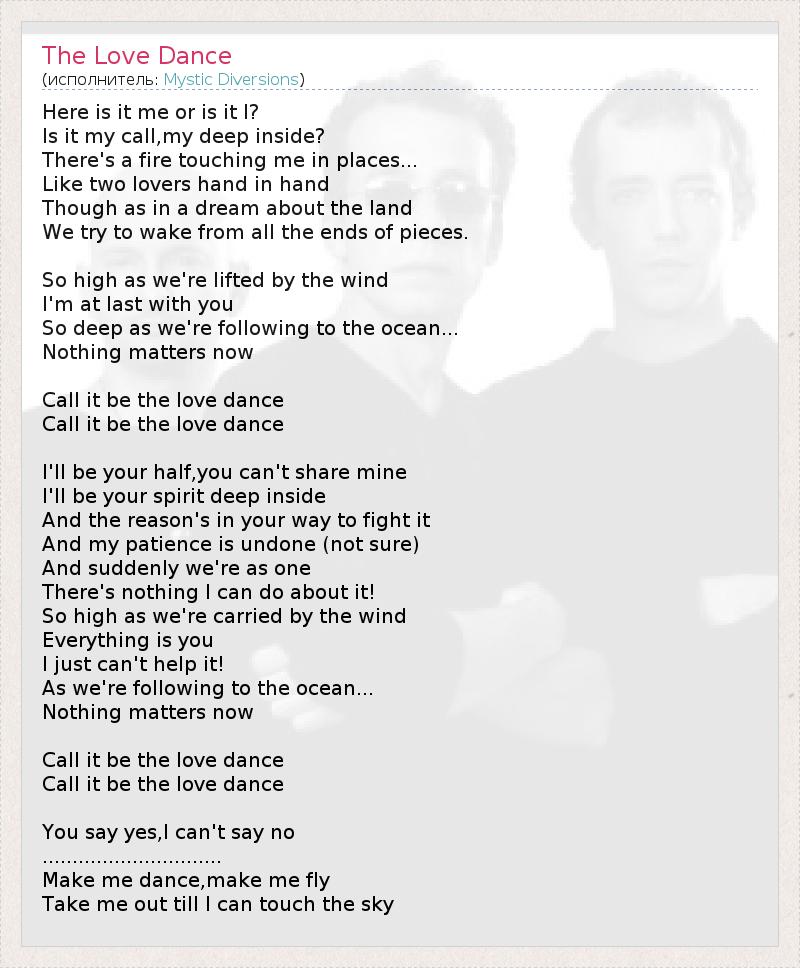 Here is it me or is it I? Is it my call,my deep inside? There's a fire touching me in places... Like two lovers hand in hand Though as in a dream about the land We try to wake from all the ends of pieces. So high as we're lifted by the wind I'm at last with you So deep as we're following to the ocean... Nothing matters now Call it be the love dance Call it be the love dance I'll be your half,you can't share mine I'll be your spirit deep inside And the reason's in your way to fight it And my patience is undone (not sure) And suddenly we're as one There's nothing I can do about it! So high as we're carried by the wind Everything is you I just can't help it! As we're following to the ocean... Nothing matters now Call it be the love dance Call it be the love dance You say yes,I can't say no .............................. Make me dance,make me fly Take me out till I can touch the sky