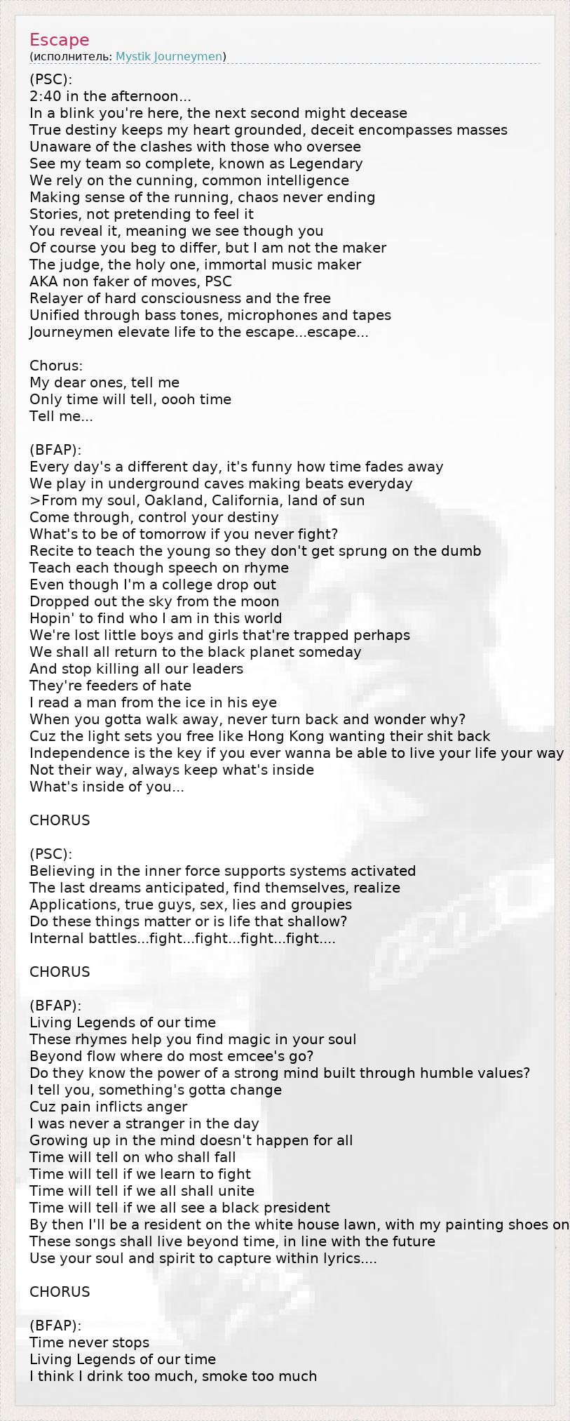 Это интересно:Luckyiam и Sunspot Jonz, основатели небезызвестного андеграундного коллектива Living Legends из Восточного Оукленда, сошлись вместе как Mystik Journeymen в 1992-м году. Обитатель Южной Калифорнии Luckyiam познакомился с Sunspot Jonz'ом в Оукленде во время поездки к своей девушке, впоследствии чего последний присоединился к группе (в то время в нее входили еще... продолжение