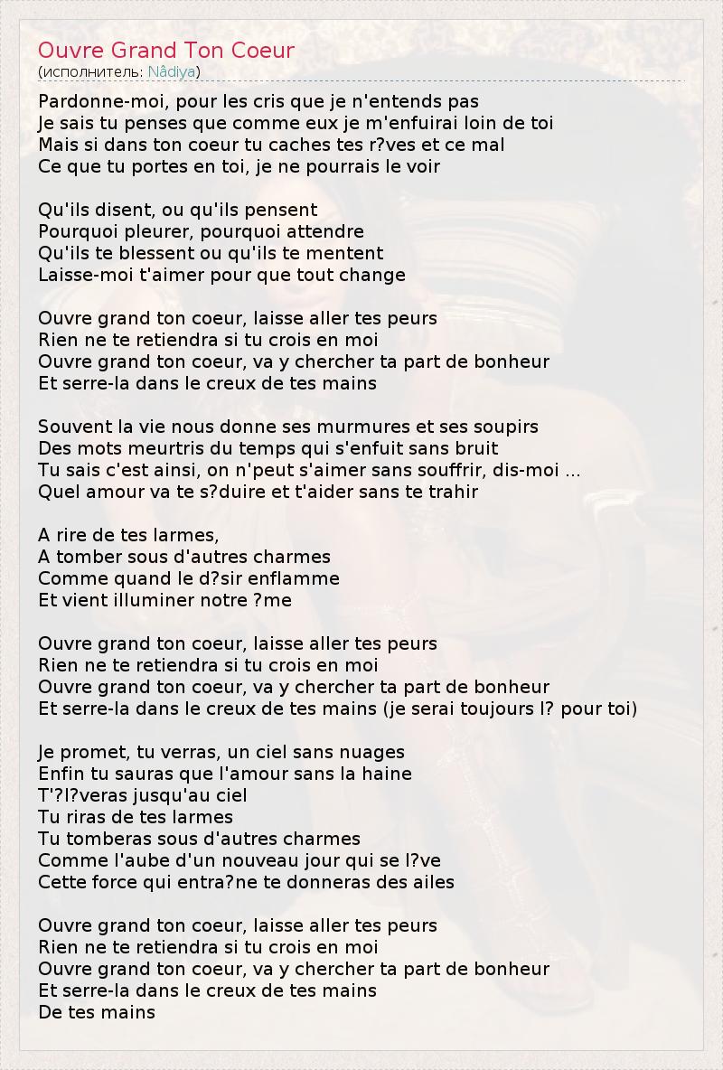 Pardonne-moi, pour les cris que je n'entends pas Je sais tu penses que comme eux je m'enfuirai loin de toi Mais si dans ton coeur tu caches tes r?ves et ce mal Ce que tu portes en toi, je ne pourrais le voir Qu'ils disent, ou qu'ils pensent Pourquoi pleurer, pourquoi attendre Qu'ils te blessent ou qu'ils te mentent Laisse-moi t'aimer pour que tout change Ouvre grand ton coeur, laisse aller tes peurs Rien ne te retiendra si tu crois en moi Ouvre grand ton coeur, va y chercher ta part de bonheur Et serre-la dans le creux de tes mains Souvent la vie nous donne ses murmures et ses soupirs Des mots meurtris du temps qui s'enfuit sans bruit Tu sais c'est ainsi, on n'peut s'aimer sans souffrir, dis-moi ... Quel amour va te s?duire et t'aider sans te trahir A rire de tes larmes, A tomber sous d'autres charmes Comme quand le d?sir enflamme Et vient illuminer notre ?me Ouvre grand ton coeur, laisse aller tes peurs Rien ne te retiendra si tu crois en moi Ouvre grand ton coeur, va y chercher ta part de bonheur Et serre-la dans le creux de tes mains (je serai toujours l? pour toi) Je promet, tu verras, un ciel sans nuages Enfin tu sauras que l'amour sans la haine T'?l?veras jusqu'au ciel Tu riras de tes larmes Tu tomberas sous d'autres charmes Comme l'aube d'un nouveau jour qui se l?ve Cette force qui entra?ne te donneras des ailes Ouvre grand ton coeur, laisse aller tes peurs Rien ne te retiendra si tu crois en moi Ouvre grand ton coeur, va y chercher ta part de bonheur Et serre-la dans le creux de tes mains De tes mains
