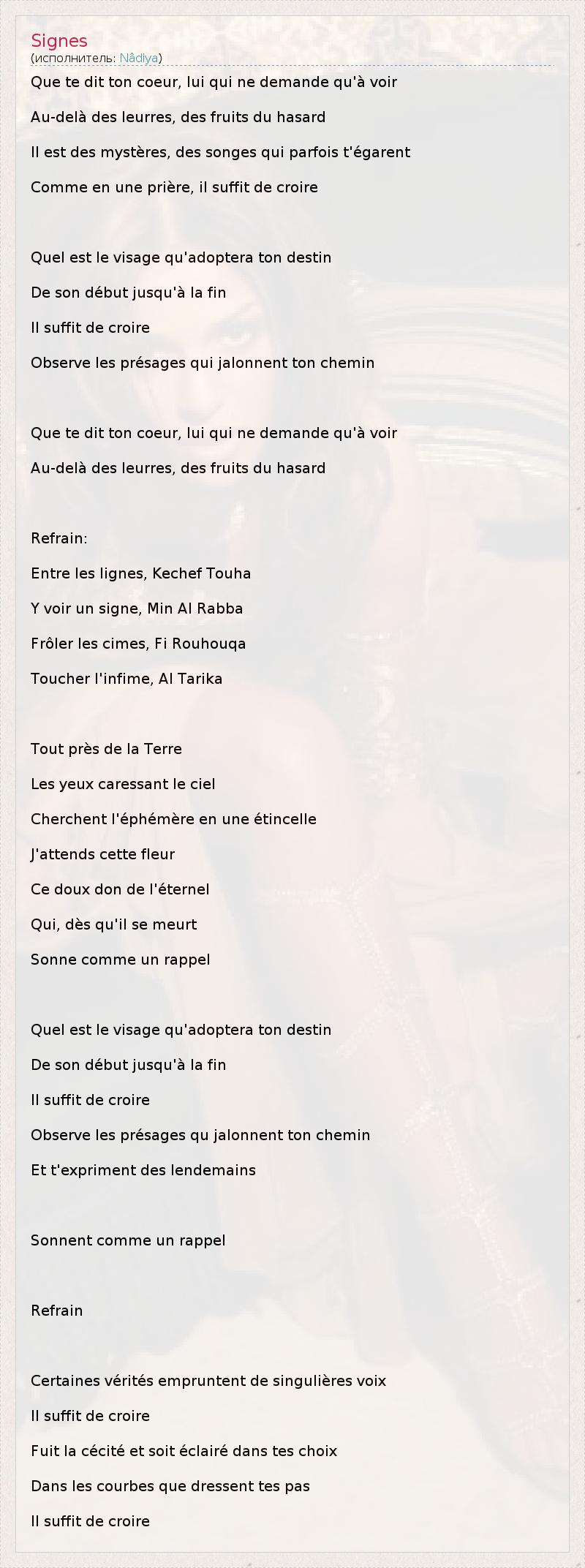 Que te dit ton coeur, lui qui ne demande qu'à voir Au-delà des leurres, des fruits du hasard Il est des mystères, des songes qui parfois t'égarent Comme en une prière, il suffit de croire Quel est le visage qu'adoptera ton destin De son début jusqu'à la fin Il suffit de croire Observe les présages qui jalonnent ton chemin Que te dit ton coeur, lui qui ne demande qu'à voir Au-delà des leurres, des fruits du hasard Refrain: Entre les lignes, Kechef Touha Y voir un signe, Min Al Rabba Frôler les cimes, Fi Rouhouqa Toucher l'infime, Al Tarika Tout près de la Terre Les yeux caressant le ciel Cherchent l'éphémère en une étincelle J'attends cette fleur Ce doux don de l'éternel Qui, dès qu'il se meurt Sonne comme un rappel Quel est le visage qu'adoptera ton destin De son début jusqu'à la fin Il suffit de croire Observe les présages qu jalonnent ton chemin Et t'expriment des lendemains Sonnent comme un rappel Refrain Certaines vérités empruntent de singulières voix Il suffit de croire Fuit la cécité et soit éclairé dans tes choix Dans les courbes que dressent tes pas Il suffit de croire