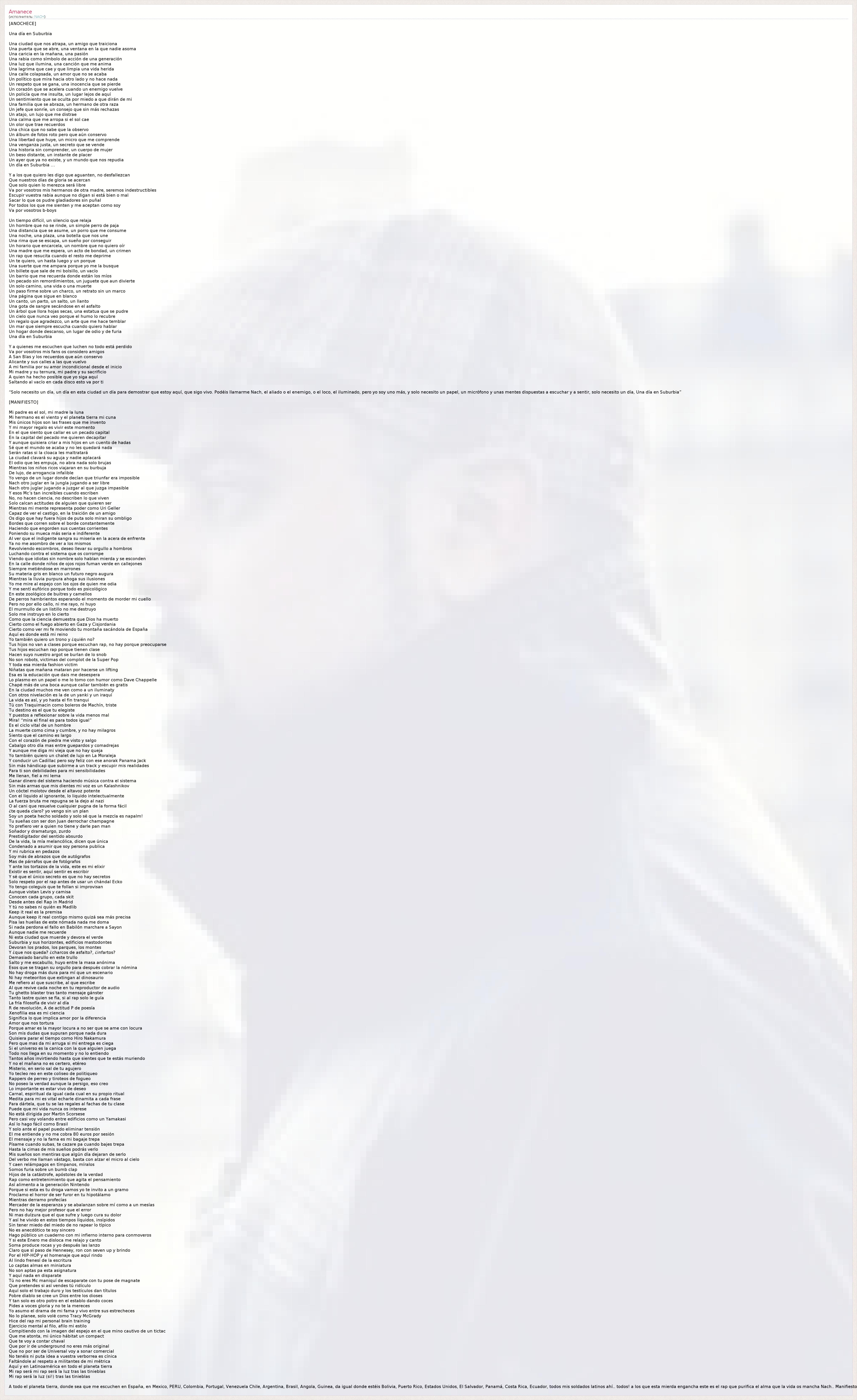A todo el planeta tierra, donde sea que me escuchen en España, en Mexico, PERU, Colombia, Portugal, Venezuela Chile, Argentina, Brasil, Angola, Guinea, da igual donde estéis Bolivia, Puerto Rico, Estados Unidos, El Salvador, Panamá, Costa Rica, Ecuador, todos mis soldados latinos ahí.. todos! a los que esta mierda engancha este es el rap que purifica el alma que la vida os mancha Nach.. Manifiesto