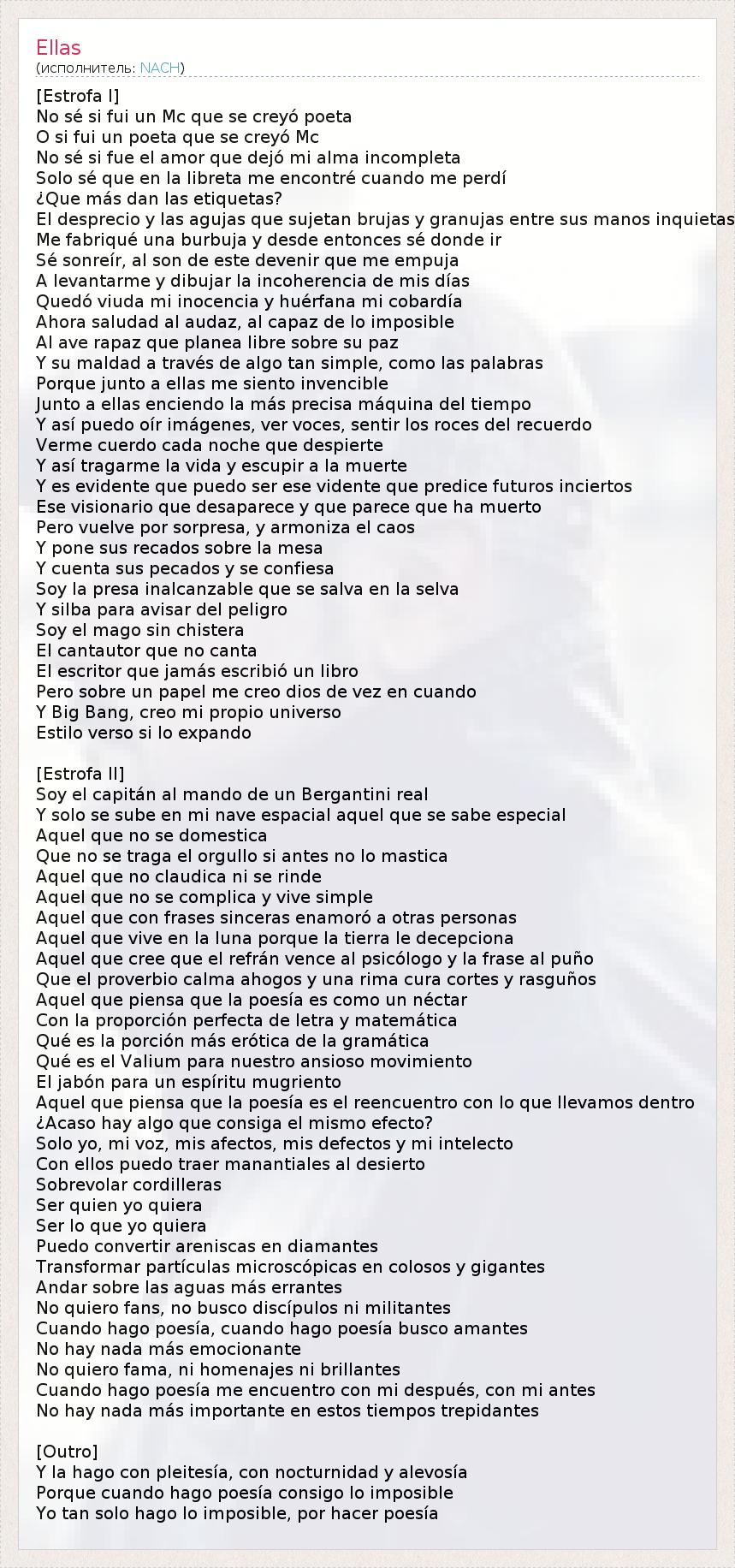 [Estrofa I] No sé si fui un Mc que se creyó poeta O si fui un poeta que se creyó Mc No sé si fue el amor que dejó mi alma incompleta Solo sé que en la libreta me encontré cuando me perdí ¿Que más dan las etiquetas? El desprecio y las agujas que sujetan brujas y granujas entre sus manos inquietas Me fabriqué una burbuja y desde entonces sé donde ir Sé sonreír, al son de este devenir que me empuja A levantarme y dibujar la incoherencia de mis días Quedó viuda mi inocencia y huérfana mi cobardía Ahora saludad al audaz, al capaz de lo imposible Al ave rapaz que planea libre sobre su paz Y su maldad a través de algo tan simple, como las palabras Porque junto a ellas me siento invencible Junto a ellas enciendo la más precisa máquina del tiempo Y así puedo oír imágenes, ver voces, sentir los roces del recuerdo Verme cuerdo cada noche que despierte Y así tragarme la vida y escupir a la muerte Y es evidente que puedo ser ese vidente que predice futuros inciertos Ese visionario que desaparece y que parece que ha muerto Pero vuelve por sorpresa, y armoniza el caos Y pone sus recados sobre la mesa Y cuenta sus pecados y se confiesa Soy la presa inalcanzable que se salva en la selva Y silba para avisar del peligro Soy el mago sin chistera El cantautor que no canta El escritor que jamás escribió un libro Pero sobre un papel me creo dios de vez en cuando Y Big Bang, creo mi propio universo Estilo verso si lo expando [Estrofa II] Soy el capitán al mando de un Bergantini real Y solo se sube en mi nave espacial aquel que se sabe especial Aquel que no se domestica Que no se traga el orgullo si antes no lo mastica Aquel que no claudica ni se rinde Aquel que no se complica y vive simple Aquel que con frases sinceras enamoró a otras personas Aquel que vive en la luna porque la tierra le decepciona Aquel que cree que el refrán vence al psicólogo y la frase al puño Que el proverbio calma ahogos y una rima cura cortes y rasguños Aquel que piensa que la poesía es como un néctar Con la proporción perfecta de letra y matemática Qué es la porción más erótica de la gramática Qué es el Valium para nuestro ansioso movimiento El jabón para un espíritu mugriento Aquel que piensa que la poesía es el reencuentro con lo que llevamos dentro ¿Acaso hay algo que consiga el mismo efecto? Solo yo, mi voz, mis afectos, mis defectos y mi intelecto Con ellos puedo traer manantiales al desierto Sobrevolar cordilleras Ser quien yo quiera Ser lo que yo quiera Puedo convertir areniscas en diamantes Transformar partículas microscópicas en colosos y gigantes Andar sobre las aguas más errantes No quiero fans, no busco discípulos ni militantes Cuando hago poesía, cuando hago poesía busco amantes No hay nada más emocionante No quiero fama, ni homenajes ni brillantes Cuando hago poesía me encuentro con mi después, con mi antes No hay nada más importante en estos tiempos trepidantes [Outro] Y la hago con pleitesía, con nocturnidad y alevosía Porque cuando hago poesía consigo lo imposible Yo tan solo hago lo imposible, por hacer poesía
