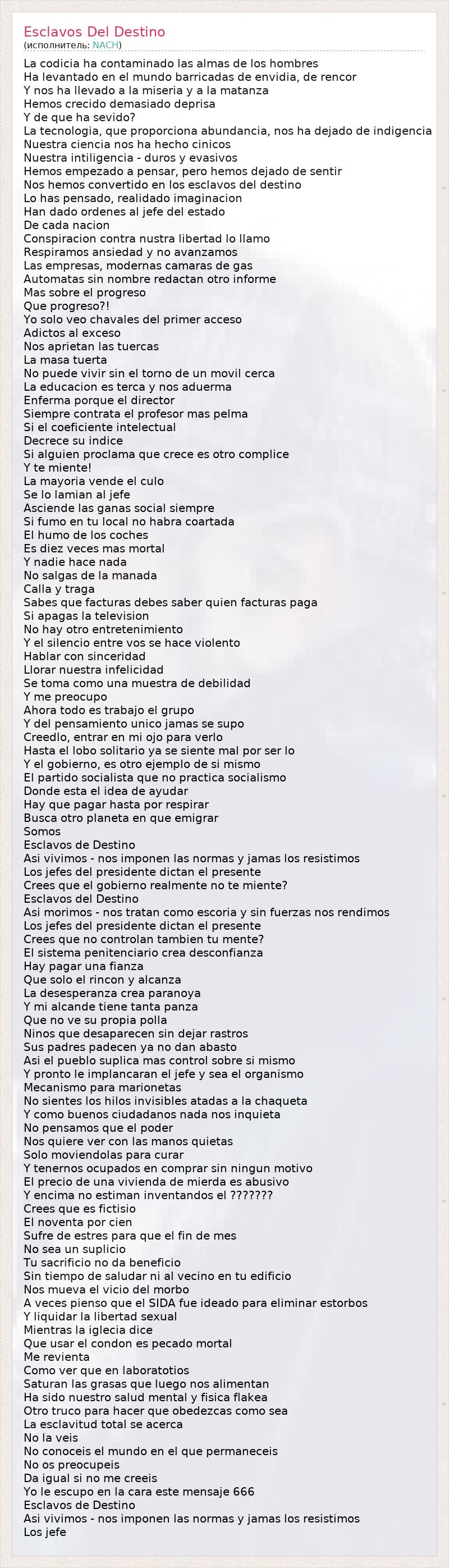 La codicia ha contaminado las almas de los hombres Ha levantado en el mundo barricadas de envidia, de rencor Y nos ha llevado a la miseria y a la matanza Hemos crecido demasiado deprisa Y de que ha sevido? La tecnologia, que proporciona abundancia, nos ha dejado de indigencia Nuestra ciencia nos ha hecho cinicos Nuestra intiligencia - duros y evasivos Hemos empezado a pensar, pero hemos dejado de sentir Nos hemos convertido en los esclavos del destino Lo has pensado, realidado imaginacion Han dado ordenes al jefe del estado De cada nacion Conspiracion contra nustra libertad lo llamo Respiramos ansiedad y no avanzamos Las empresas, modernas camaras de gas Automatas sin nombre redactan otro informe Mas sobre el progreso Que progreso?! Yo solo veo chavales del primer acceso Adictos al exceso Nos aprietan las tuercas La masa tuerta No puede vivir sin el torno de un movil cerca La educacion es terca y nos aduerma Enferma porque el director Siempre contrata el profesor mas pelma Si el coeficiente intelectual Decrece su indice Si alguien proclama que crece es otro complice Y te miente! La mayoria vende el culo Se lo lamian al jefe Asciende las ganas social siempre Si fumo en tu local no habra coartada El humo de los coches Es diez veces mas mortal Y nadie hace nada No salgas de la manada Calla y traga Sabes que facturas debes saber quien facturas paga Si apagas la television No hay otro entretenimiento Y el silencio entre vos se hace violento Hablar con sinceridad Llorar nuestra infelicidad Se toma como una muestra de debilidad Y me preocupo Ahora todo es trabajo el grupo Y del pensamiento unico jamas se supo Creedlo, entrar en mi ojo para verlo Hasta el lobo solitario ya se siente mal por ser lo Y el gobierno, es otro ejemplo de si mismo El partido socialista que no practica socialismo Donde esta el idea de ayudar Hay que pagar hasta por respirar Busca otro planeta en que emigrar Somos Esclavos de Destino Asi vivimos - nos imponen las normas y jamas los resistimos Los jefes del presidente dictan el presente Crees que el gobierno realmente no te miente? Esclavos del Destino Asi morimos - nos tratan como escoria y sin fuerzas nos rendimos Los jefes del presidente dictan el presente Crees que no controlan tambien tu mente? El sistema penitenciario crea desconfianza Hay pagar una fianza Que solo el rincon y alcanza La desesperanza crea paranoya Y mi alcande tiene tanta panza Que no ve su propia polla Ninos que desaparecen sin dejar rastros Sus padres padecen ya no dan abasto Asi el pueblo suplica mas control sobre si mismo Y pronto le implancaran el jefe y sea el organismo Mecanismo para marionetas No sientes los hilos invisibles atadas a la chaqueta Y como buenos ciudadanos nada nos inquieta No pensamos que el poder Nos quiere ver con las manos quietas Solo moviendolas para curar Y tenernos ocupados en comprar sin ningun motivo El precio de una vivienda de mierda es abusivo Y encima no estiman inventandos el ??????? Crees que es fictisio El noventa por cien Sufre de estres para que el fin de mes No sea un suplicio Tu sacrificio no da beneficio Sin tiempo de saludar ni al vecino en tu edificio Nos mueva el vicio del morbo A veces pienso que el SIDA fue ideado para eliminar estorbos Y liquidar la libertad sexual Mientras la iglecia dice Que usar el condon es pecado mortal Me revienta Como ver que en laboratotios Saturan las grasas que luego nos alimentan Ha sido nuestro salud mental y fisica flakea Otro truco para hacer que obedezcas como sea La esclavitud total se acerca No la veis No conoceis el mundo en el que permaneceis No os preocupeis Da igual si no me creeis Yo le escupo en la cara este mensaje 666 Esclavos de Destino Asi vivimos - nos imponen las normas y jamas los resistimos Los jefe
