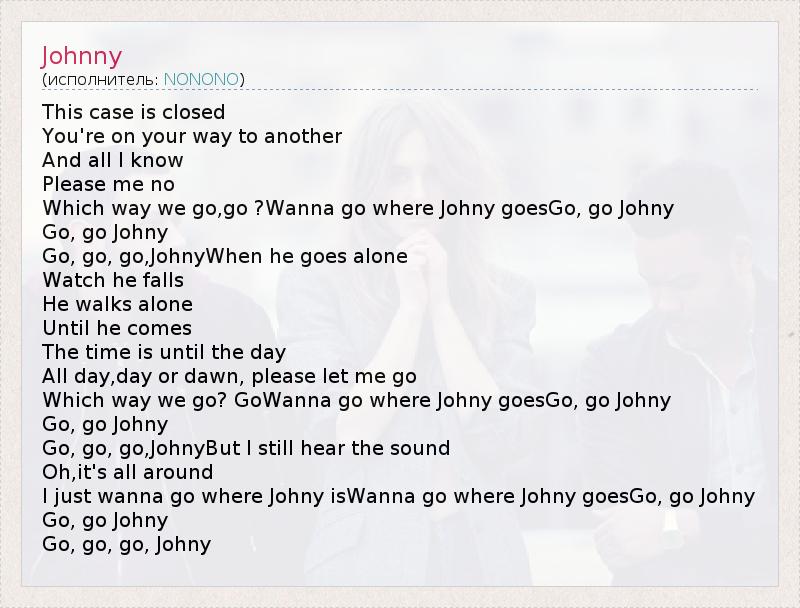 This case is closed You're on your way to another And all I know Please me no Which way we go,go ?Wanna go where Johny goesGo, go Johny Go, go Johny Go, go, go,JohnyWhen he goes alone Watch he falls He walks alone Until he comes The time is until the day All day,day or dawn, please let me go Which way we go? GoWanna go where Johny goesGo, go Johny Go, go Johny Go, go, go,JohnyBut I still hear the sound Oh,it's all around I just wanna go where Johny isWanna go where Johny goesGo, go Johny Go, go Johny Go, go, go, Johny