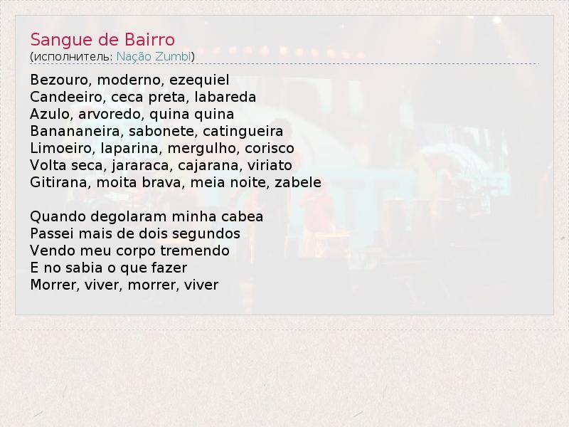 А как ты думаешь, о чем песня "Sangue de Bairro" ?