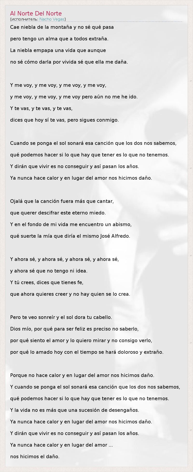 Cae niebla de la montaña y no sé qué pasa pero tengo un alma que a todos extraña. La niebla empapa una vida que aunque no sé cómo darla por vivida sé que ella me daña. Y me voy, y me voy, y me voy, y me voy, y me voy, y me voy, y me voy pero aún no me he ido. Y te vas, y te vas, y te vas, dices que hoy sí te vas, pero sigues conmigo. Cuando se ponga el sol sonará esa canción que los dos nos sabemos, qué podemos hacer si lo que hay que tener es lo que no tenemos. Y dirán que vivir es no conseguir y así pasan los años. Ya nunca hace calor y en lugar del amor nos hicimos daño. Ojalá que la canción fuera más que cantar, que querer descifrar este eterno miedo. Y en el fondo de mi vida me encuentro un abismo, qué suerte la mía que diría el mismo José Alfredo. Y ahora sé, y ahora sé, y ahora sé, y ahora sé, y ahora sé que no tengo ni idea. Y tú crees, dices que tienes fe, que ahora quieres creer y no hay quien se lo crea. Pero te veo sonreír y el sol dora tu cabello. Dios mío, por qué para ser feliz es preciso no saberlo, por qué siento el amor y lo quiero mirar y no consigo verlo, por qué lo amado hoy con el tiempo se hará doloroso y extraño. Porque no hace calor y en lugar del amor nos hicimos daño. Y cuando se ponga el sol sonará esa canción que los dos nos sabemos, qué podemos hacer si lo que hay que tener es lo que no tenemos. Y la vida no es más que una sucesión de desengaños. Ya nunca hace calor y en lugar del amor nos hicimos daño. Y dirán que vivir es no conseguir y así pasan los años. Ya nunca hace calor y en lugar del amor ... nos hicimos el daño.