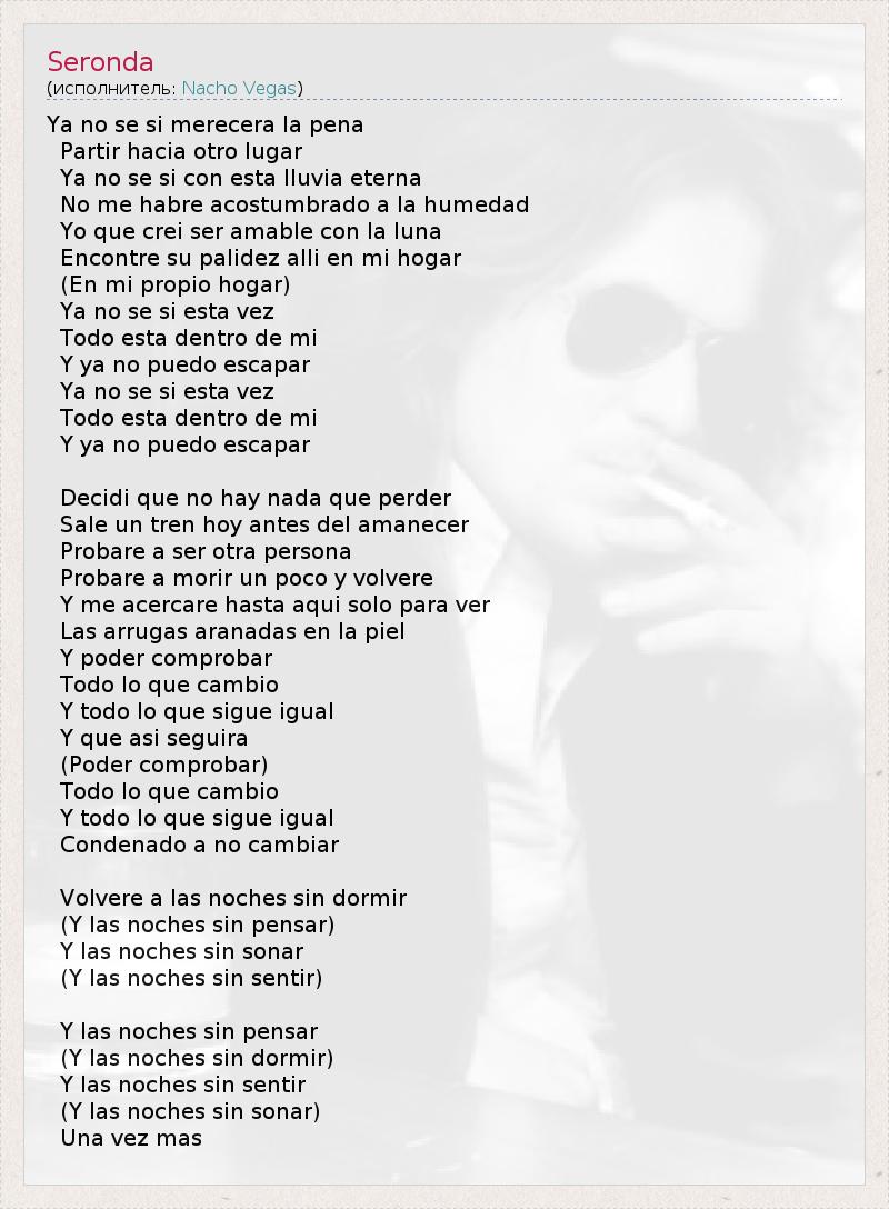 Ya no se si merecera la pena Partir hacia otro lugar Ya no se si con esta lluvia eterna No me habre acostumbrado a la humedad Yo que crei ser amable con la luna Encontre su palidez alli en mi hogar (En mi propio hogar) Ya no se si esta vez Todo esta dentro de mi Y ya no puedo escapar Ya no se si esta vez Todo esta dentro de mi Y ya no puedo escapar Decidi que no hay nada que perder Sale un tren hoy antes del amanecer Probare a ser otra persona Probare a morir un poco y volvere Y me acercare hasta aqui solo para ver Las arrugas aranadas en la piel Y poder comprobar Todo lo que cambio Y todo lo que sigue igual Y que asi seguira (Poder comprobar) Todo lo que cambio Y todo lo que sigue igual Condenado a no cambiar Volvere a las noches sin dormir (Y las noches sin pensar) Y las noches sin sonar (Y las noches sin sentir) Y las noches sin pensar (Y las noches sin dormir) Y las noches sin sentir (Y las noches sin sonar) Una vez mas