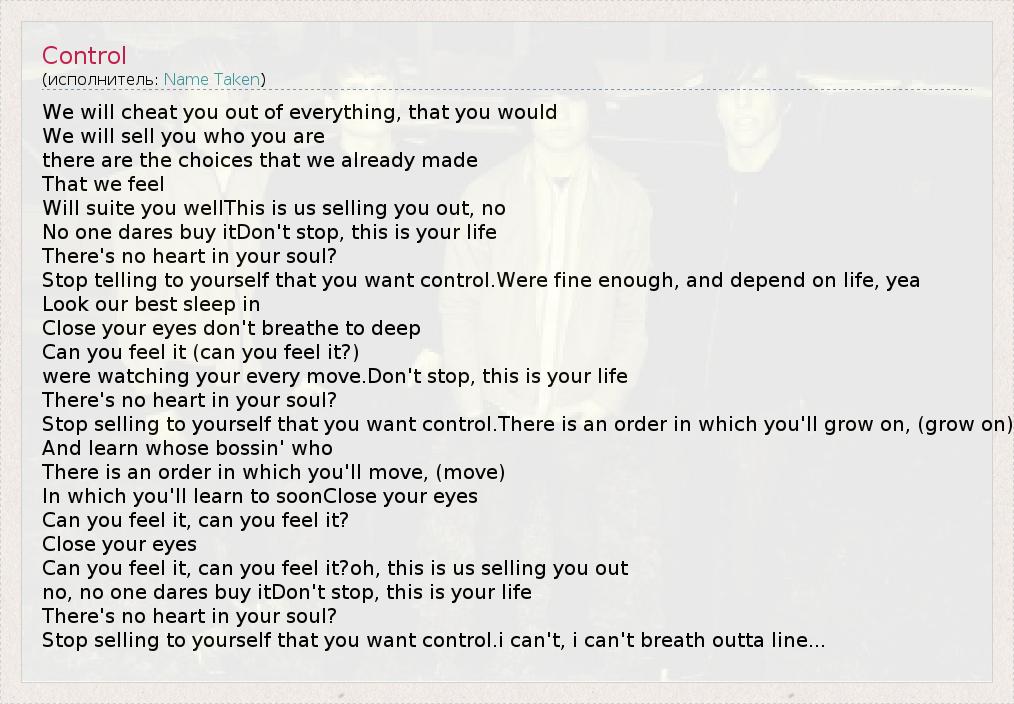 Stop selling to yourself that you want control.i can't, i can't breath outta line...