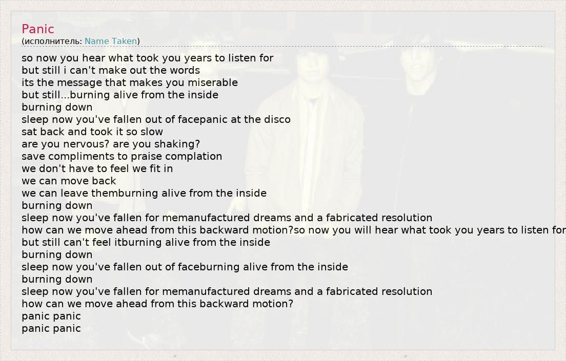 so now you hear what took you years to listen for but still i can't make out the words its the message that makes you miserable but still...burning alive from the inside burning down sleep now you've fallen out of facepanic at the disco sat back and took it so slow are you nervous? are you shaking? save compliments to praise complation we don't have to feel we fit in we can move back we can leave themburning alive from the inside burning down sleep now you've fallen for memanufactured dreams and a fabricated resolution how can we move ahead from this backward motion?so now you will hear what took you years to listen for but still can't feel itburning alive from the inside burning down sleep now you've fallen out of faceburning alive from the inside burning down sleep now you've fallen for memanufactured dreams and a fabricated resolution how can we move ahead from this backward motion? panic panic panic panic