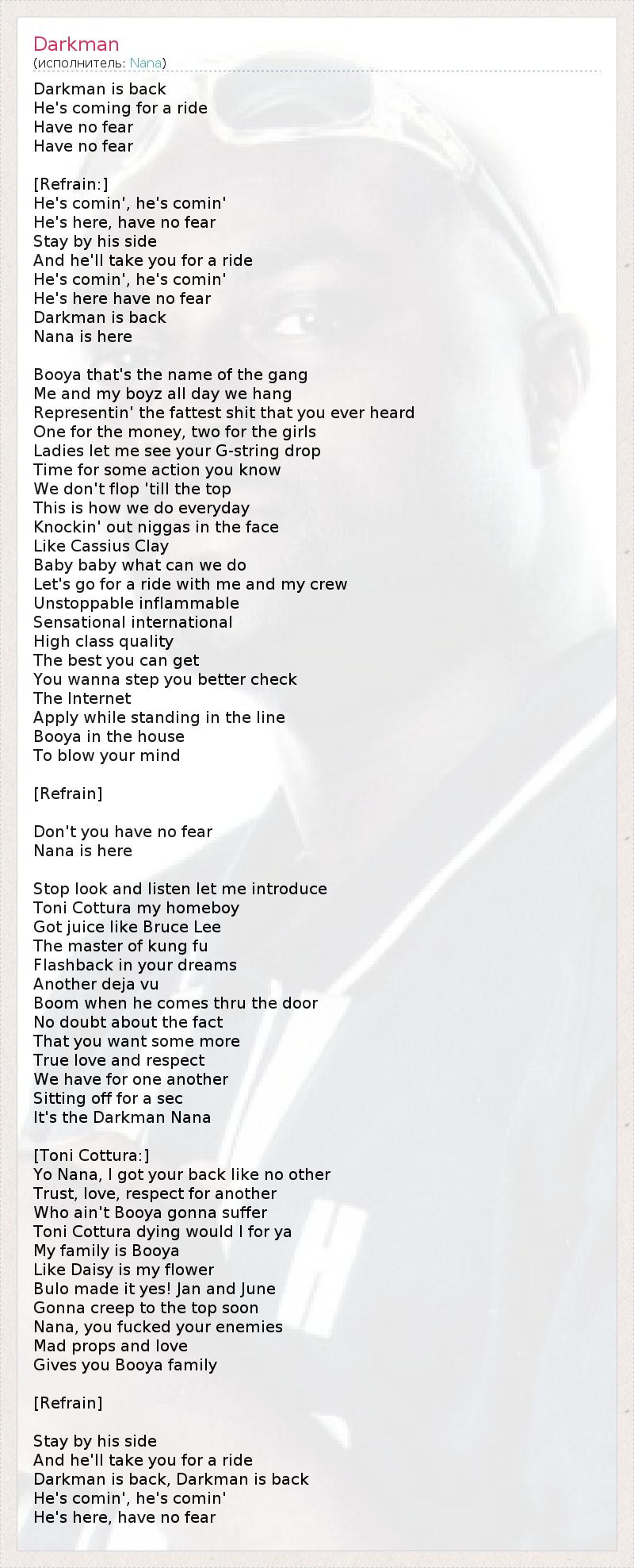 Darkman is back He's coming for a ride Have no fear Have no fear [Refrain:] He's comin', he's comin' He's here, have no fear Stay by his side And he'll take you for a ride He's comin', he's comin' He's here have no fear Darkman is back Nana is here Booya that's the name of the gang Me and my boyz all day we hang Representin' the fattest shit that you ever heard One for the money, two for the girls Ladies let me see your G-string drop Time for some action you know We don't flop 'till the top This is how we do everyday Knockin' out niggas in the face Like Cassius Clay Baby baby what can we do Let's go for a ride with me and my crew Unstoppable inflammable Sensational international High class quality The best you can get You wanna step you better check The Internet Apply while standing in the line Booya in the house To blow your mind [Refrain] Don't you have no fear Nana is here Stop look and listen let me introduce Toni Cottura my homeboy Got juice like Bruce Lee The master of kung fu Flashback in your dreams Another deja vu Boom when he comes thru the door No doubt about the fact That you want some more True love and respect We have for one another Sitting off for a sec It's the Darkman Nana [Toni Cottura:] Yo Nana, I got your back like no other Trust, love, respect for another Who ain't Booya gonna suffer Toni Cottura dying would I for ya My family is Booya Like Daisy is my flower Bulo made it yes! Jan and June Gonna creep to the top soon Nana, you fucked your enemies Mad props and love Gives you Booya family [Refrain] Stay by his side And he'll take you for a ride Darkman is back, Darkman is back He's comin', he's comin' He's here, have no fear