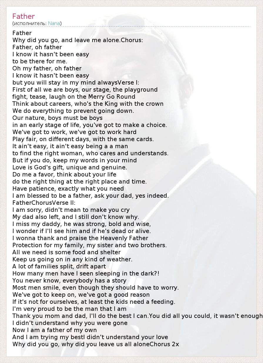 Father Why did you go, and leave me alone.Chorus: Father, oh father I know it hasn't been easy to be there for me. Oh my father, oh father I know it hasn't been easy but you will stay in my mind alwaysVerse I: First of all we are boys, our stage, the playground fight, tease, laugh on the Merry Go Round Think about careers, who's the King with the crown We do everything to prevent going down. Our nature, boys must be boys in an early stage of life, you've got to make a choice. We've got to work, we've got to work hard Play fair, on different days, with the same cards. It ain't easy, it ain't easy being a a man to find the right woman, who cares and understands. But if you do, keep my words in your mind Love is God's gift, unique and genuine. Do me a favor, think about your life do the right thing at the right place and time. Have patience, exactly what you need I am blessed to be a father, ask your dad, yes indeed. FatherChorusVerse II: I am sorry, didn't mean to make you cry My dad also left, and I still don't know why. I miss my daddy, he was strong, bold and wise, I wonder if I'll see him and if he's dead or alive. I wonna thank and praise the Heavenly Father Protection for my family, my sister and two brothers. All we need is some food and shelter Keep us going on in any kind of weather. A lot of families split, drift apart How many men have I seen sleeping in the dark?! You never know, everybody has a story Most men smile, even though they should have to worry. We've got to keep on, we've got a good reason If it's not for ourselves, at least the kids need a feeding. I'm very proud to be the man that I am Thank you mom and dad, I'll do the best I can.You did all you could, it wasn't enough I didn't understand why you were gone Now I am a father of my own And I am trying my bestI didn't understand your love Why did you go, why did you leave us all aloneChorus 2x
