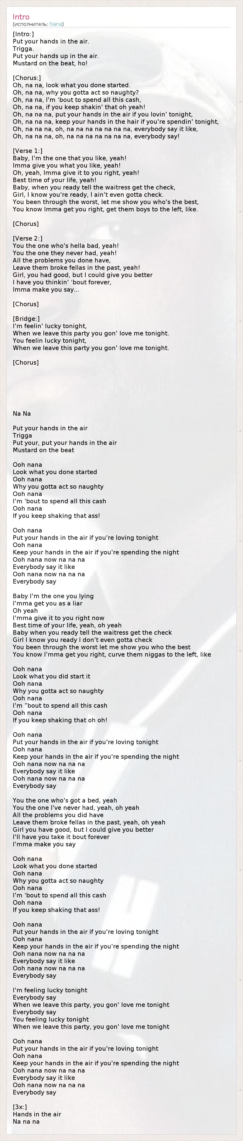 [Вступление:] Поднимите руки вверх. Тригга. 1 Поднимите, поднимите руки вверх. Мастард на битах, шл**а! 2 [Припев:] У-на-на, погляди, что ты начала. У-на-на, зачем вести себя так плохо? У-на-на, я собираюсь потратить все деньги, У-на-на, если ты продолжишь трясти своей, о, да! У-на-на-на, поднимите руки вверх, если сегодня ночью будете любить, У-на-на-на, поднимите руки вверх, если сегодня ночью будете тратиться, У-на-на-на, у-на-на-на-на-на-на-на, все скажите, У-на-на-на, у-на-на-на-на-на-на-на, все скажите! [Куплет 1:] Детка, я тот, кто тебе нравится, да! Я подарю то, что тебе нравится, да! О, да, я преподнесу тебе правильно, да! Лучшие мгновения в твоей жизни, да! Детка, когда будешь готова, вели официантке принести чек, Девочка, я знаю: ты готова, можно и не проверять. Ты прошла через худшее, дай я покажу тебе, кто лучший, Знаешь, я поступлю с тобой правильно, можешь посылать других парней на выход. [Припев] [Куплет 2:] Ты из тех, кто дико пошлые, да! Ты та, которой у других никогда не было, да! Все проблемы, которые у тебя были, И бедных ухажёров, оставь их в прошлом, да! Девочка, у тебя было и хорошее, но я могу дать тебе лучшее, Со мной ты задумаешься о вечности, Со мной ты скажешь... [Припев] [Связка:] Сегодня ночью мне повезёт, Когда мы уйдём с вечеринки сегодня ночью, ты будешь любить меня. Сегодня ночью тебе повезёт, Когда мы уйдём с вечеринки сегодня ночью, ты будешь любить меня. [Припев] 1 — Название шестого студийного альбома Трея Сонгза, первым синглом с которого и стала эта песня. 2 — DJ Mustard — псевдоним Дижона Макфарлена, продюсера данной композиции. Вышеуказанной фразой он предваряет большинство своих песен. На-на (перевод Алекс) Поднимите руки вверх! Trigga! 3 Поднимите, поднимите руки вверх! Mustard 4 за пультом. О-о, на-на! Посмотри, что ты делаешь. О-о, на-на! Почему ты такая плохая девочка? О-о, на-на! Я истрачу все свои деньги, О-о, на-на! Если ты будешь продолжать трясти своим задом. О-о, на-на! Поднимите руки вверх, если вы влюблены этой ночью. О-о, на-на! Поднимите руки вверх, если вы веселитесь этой ночью. О-о, на-на! А теперь: на-на-на! Все вместе! О-о, на-на! А теперь: на-на-на! Вместе! Малышка, ты обманываешь меня. Я поймал тебя на лжи. О, да! Я дам тебе это – Лучшее время в твоей жизни, да, да! Крошка, когда будешь готова, скажи официантке принести счёт. Девочка, я знаю, что ты готова, мне не нужен счёт. Худшее позади, позволь мне показать тебе, кто лучший. Я прекрасно тебя понимаю, брось других ниггеров. О-о, на-на! Посмотри, что ты сделала. Начинай! О-о, на-на! Почему ты такая плохая девочка? О-о, на-на! Я готов потратить все свои деньги. О-о, на-на! Если ты будешь продолжать трясти ей... о-о! О-о, на-на! Поднимите руки вверх, если вы влюблены этой ночью. О-о, на-на! Поднимите руки вверх, если вы веселитесь этой ночью. О-о, на-на! А теперь: на-на-на! Все вместе! О-о, на-на! А теперь: на-на-на! Вместе! У тебя есть кроватка, да! А у меня её никогда не было, да, да! Все свои проблемы, Всех непутёвых парней оставь в прошлом, да, да! Девочка, у тебя хороший парень, но я лучше. Я буду с тобой всегда. Я заставлю тебя сказать: О-о, на-на! Посмотри, что ты делаешь. О-о, на-на! Почему ты такая плохая девочка? О-о, на-на! Я истрачу все свои деньги, О-о, на-на! Если ты будешь продолжать трясти своим задом. О-о, на-на! Поднимите руки вверх, если вы влюблены этой ночью. О-о, на-на! Поднимите руки вверх, если вы веселитесь этой ночью. О-о, на-на! А теперь: на-на-на! Все