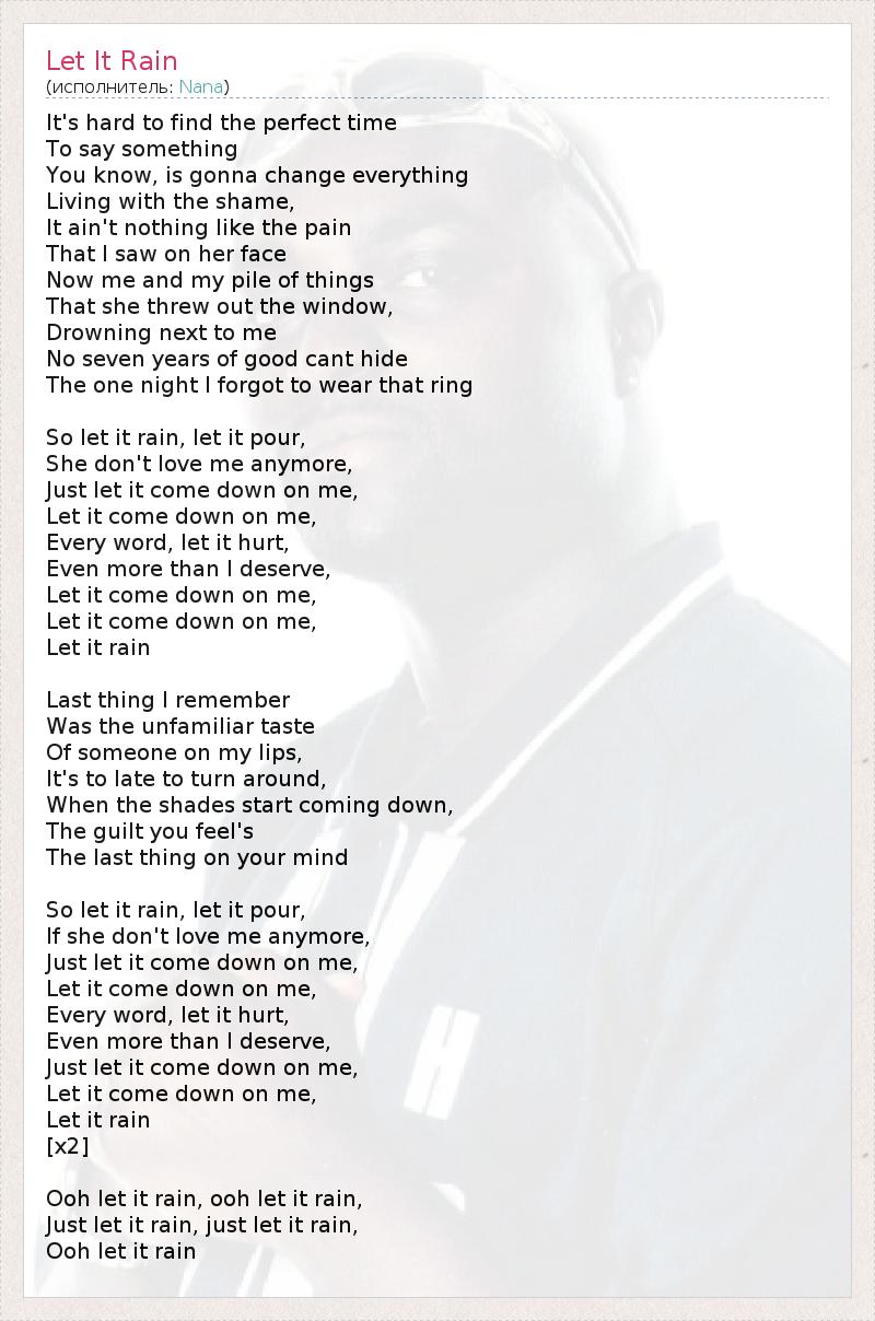 Трудно найти идеальный момент, Чтобы что-то сказать, Знаешь, это все изменит. Я живу с этим позором, Нет ничего хуже той боли, Что я видел в ее лице, А теперь куча моих вещей, Которые она вышвырнула из окна, Приземляются рядом со мной. Никакие семь лет счастья не смогут затмить Всего одну ночь, когда я забыл надеть кольцо. Так пусть идет дождь, пусть он льет, Она не любит меня больше, Пусть он просто льется на меня, Пусть он льется на меня. Каждое слово пусть причиняет боль, Даже большую, чем я заслуживаю, Пусть он льется на меня, Пусть он льется на меня, Пусть идет дождь. Последнее, что я помню - Чей-то незнакомый вкус На моих губах, Слишком поздно оборачиваться назад. Когда начинают сгущаться сумерки, Лишь чувство вины Остается в твоем сознании. Так пусть идет дождь, пусть он льет, Если она не любит меня больше, Пусть он просто льется на меня, Пусть он льется на меня. Каждое слово пусть причиняет боль, Даже большую, чем я заслуживаю, Пусть он льется на меня, Пусть он льется на меня, Пусть идет дождь. [x2] Ооо, пусть идет дождь, ооо, пусть идет дождь, Просто пусть идет дождь, просто пусть идет дождь, Ооо, пусть идет дождь.