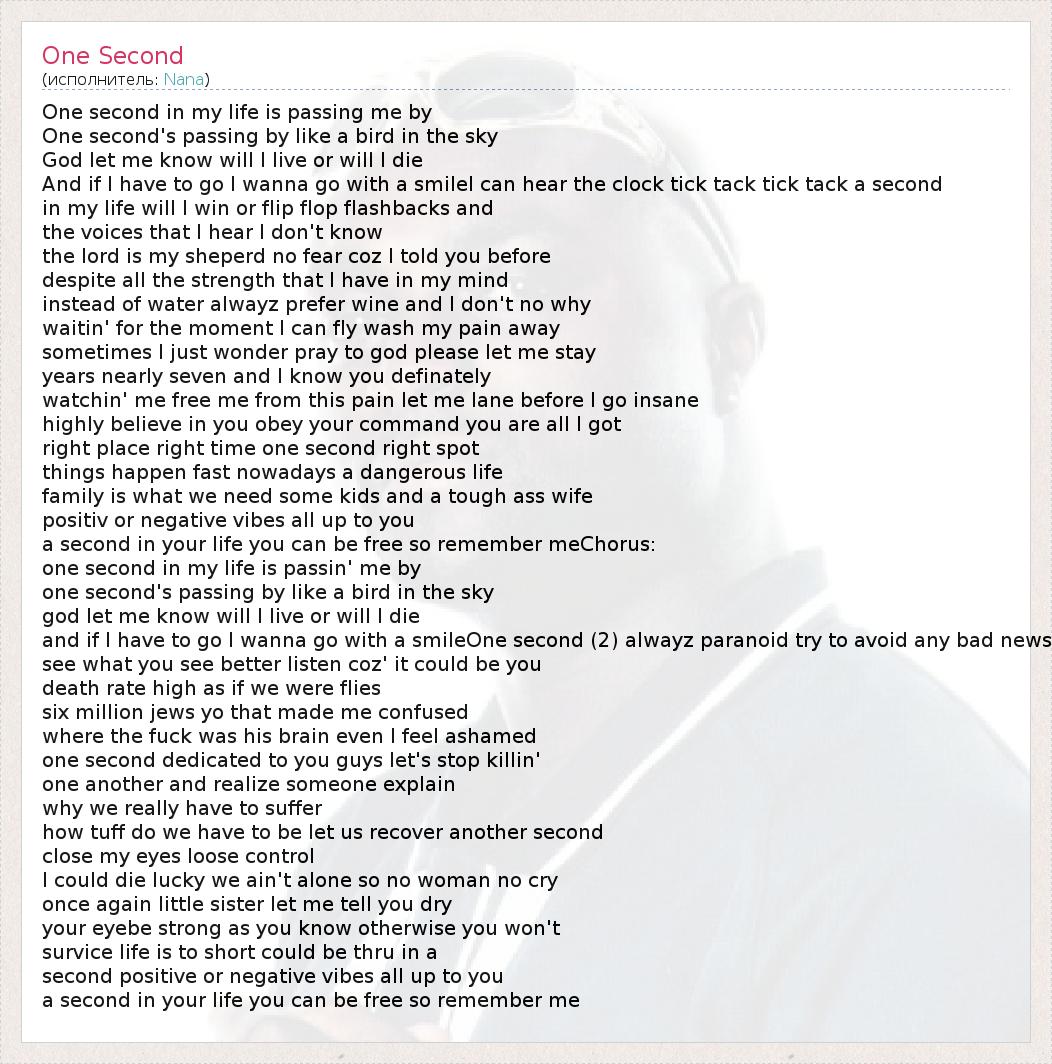 One second in my life is passing me by One second's passing by like a bird in the sky God let me know will I live or will I die And if I have to go I wanna go with a smileI can hear the clock tick tack tick tack a second in my life will I win or flip flop flashbacks and the voices that I hear I don't know the lord is my sheperd no fear coz I told you before despite all the strength that I have in my mind instead of water alwayz prefer wine and I don't no why waitin' for the moment I can fly wash my pain away sometimes I just wonder pray to god please let me stay years nearly seven and I know you definately watchin' me free me from this pain let me lane before I go insane highly believe in you obey your command you are all I got right place right time one second right spot things happen fast nowadays a dangerous life family is what we need some kids and a tough ass wife positiv or negative vibes all up to you a second in your life you can be free so remember meChorus: one second in my life is passin' me by one second's passing by like a bird in the sky god let me know will I live or will I die and if I have to go I wanna go with a smileOne second (2) alwayz paranoid try to avoid any bad news see what you see better listen coz' it could be you death rate high as if we were flies six million jews yo that made me confused where the fuck was his brain even I feel ashamed one second dedicated to you guys let's stop killin' one another and realize someone explain why we really have to suffer how tuff do we have to be let us recover another second close my eyes loose control I could die lucky we ain't alone so no woman no cry once again little sister let me tell you dry your eyebe strong as you know otherwise you won't survice life is to short could be thru in a second positive or negative vibes all up to you a second in your life you can be free so remember me