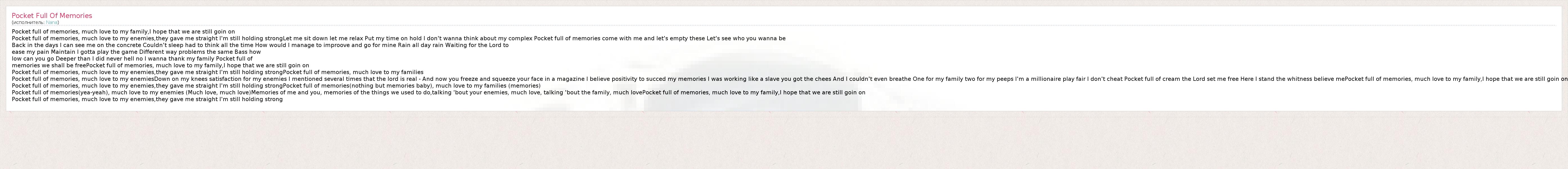 Pocket full of memories, much love to my family,I hope that we are still goin on Pocket full of memories, much love to my enemies,they gave me straight I'm still holding strongLet me sit down let me relax Put my time on hold I don't wanna think about my complex Pocket full of memories come with me and let's empty these Let's see who you wanna be Back in the days I can see me on the concrete Couldn't sleep had to think all the time How would I manage to improove and go for mine Rain all day rain Waiting for the Lord to ease my pain Maintain I gotta play the game Different way problems the same Bass how low can you go Deeper than I did never hell no I wanna thank my family Pocket full of memories we shall be freePocket full of memories, much love to my family,I hope that we are still goin on Pocket full of memories, much love to my enemies,they gave me straight I'm still holding strongPocket full of memories, much love to my families Pocket full of memories, much love to my enemiesDown on my knees satisfaction for my enemies I mentioned several times that the lord is real - And now you freeze and squeeze your face in a magazine I believe positivity to succed my memories I was working like a slave you got the chees And I couldn't even breathe One for my family two for my peeps I'm a millionaire play fair I don't cheat Pocket full of cream the Lord set me free Here I stand the whitness believe mePocket full of memories, much love to my family,I hope that we are still goin on Pocket full of memories, much love to my enemies,they gave me straight I'm still holding strongPocket full of memories(nothing but memories baby), much love to my families (memories) Pocket full of memories(yea-yeah), much love to my enemies (Much love, much love)Memories of me and you, memories of the things we used to do,talking 'bout your enemies, much love, talking 'bout the family, much lovePocket full of memories, much love to my family,I hope that we are still goin on Pocket full of memories, much love to my enemies,they gave me straight I'm still holding strong
