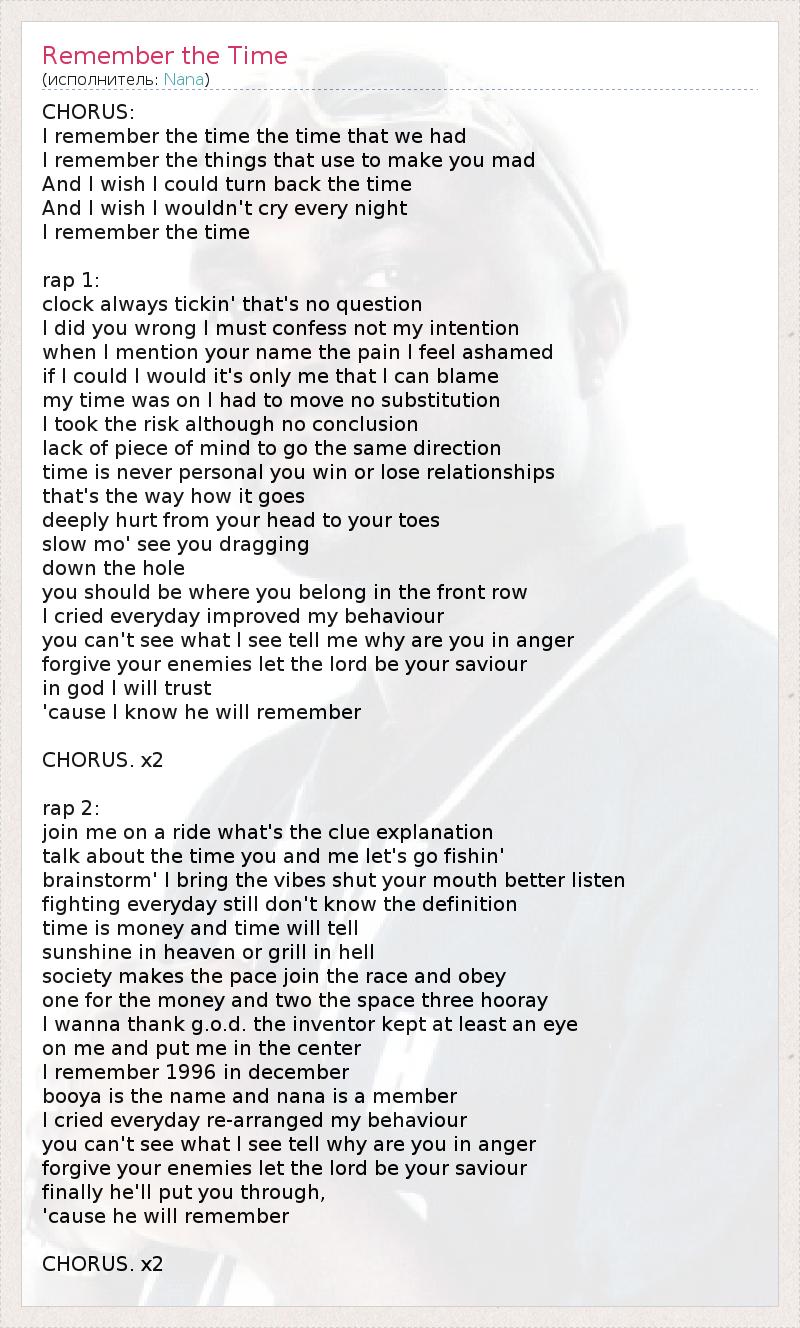 ПРИПЕВ: Я помню то время, когда мы были вместе. Я помню то, что сводило тебя с ума. Жаль, что я не могу повернуть время вспять. Я больше не хочу плакать по ночам. Я помню то время. Рэп 1: Время не остановить, это бесспорно. Я плохо с тобой поступила. Я должна признать, что сделала это не нарочно. Когда я произношу твоё имя, я чувствую боль и чувство стыда. Если бы я могла, я бы всё исправила. Во всём виновата только я. Всё было в моих руках, мне не нужно было ничего менять. Я рискнула, хотя и оставила путь к отступлению. Но теперь у меня нет желания идти в том же направлении. Время не ждёт, ты завязываешь или прекращаешь отношения. Таков ход жизни. Ты ранен до глубины души. Но приостановись, посмотри, ты же катишься По наклонной плоскости, А ведь ты должен быть там, в первом ряду. Я плакала каждый день и теперь исправилась. Но ты же не можешь посмотреть на всё моими глазами, почему ты злишься? Прости своих врагов, пусть Господь будет твоим Спасителем. Я буду верить в Господа, Потому что я знаю, что он будет помнить… ПРИПЕВ: 2 раза. Рэп 2: Поехали со мной. Почему я тебе это предлагаю? Поговорим о нашем прошлом, порыбачим. Устроим мозговой штурм, я буду предлагать идеи, а ты сиди и слушай. Я борюсь каждый день, но мне всё ещё непонятны выражения: «Время – деньги» или «Время покажет». Жизнь задаёт темп, а ты не отставай и повинуйся. Раз – деньги, два – пространство, три – ура! Хочу поблагодарить Бога: Создатель, по крайней мере, не забыл Обо мне, и я в центре внимания. Я помню декабрь 1996 года: Буйа – это имя, а Нана – участник. Я плакала каждый день, я хотела измениться. Но ты же не можешь посмотреть на всё моими глазами, почему ты злишься? Прости своих врагов, пусть Господь будет твоим Спасителем. В конце концов, он заставит тебя пройти испытание, Потому что он будет помнить… ПРИПЕВ: 2 раза.