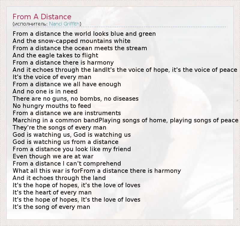 From a distance the world looks blue and green And the snow-capped mountains white From a distance the ocean meets the stream And the eagle takes to flight From a distance there is harmony And it echoes through the landIt's the voice of hope, it's the voice of peace It's the voice of every man From a distance we all have enough And no one is in need There are no guns, no bombs, no diseases No hungry mouths to feed From a distance we are instruments Marching in a common bandPlaying songs of home, playing songs of peace They're the songs of every man God is watching us, God is watching us God is watching us from a distance From a distance you look like my friend Even though we are at war From a distance I can't comprehend What all this war is forFrom a distance there is harmony And it echoes through the land It's the hope of hopes, it's the love of loves It's the heart of every man It's the hope of hopes, It's the love of loves It's the song of every man