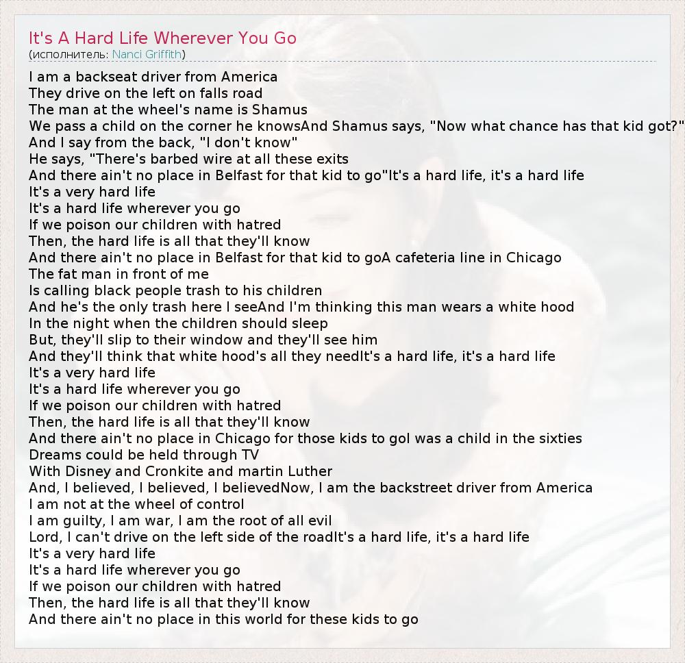 I am a backseat driver from America They drive on the left on falls road The man at the wheel's name is Shamus We pass a child on the corner he knowsAnd Shamus says, "Now what chance has that kid got?" And I say from the back, "I don't know" He says, "There's barbed wire at all these exits And there ain't no place in Belfast for that kid to go"It's a hard life, it's a hard life It's a very hard life It's a hard life wherever you go If we poison our children with hatred Then, the hard life is all that they'll know And there ain't no place in Belfast for that kid to goA cafeteria line in Chicago The fat man in front of me Is calling black people trash to his children And he's the only trash here I seeAnd I'm thinking this man wears a white hood In the night when the children should sleep But, they'll slip to their window and they'll see him And they'll think that white hood's all they needIt's a hard life, it's a hard life It's a very hard life It's a hard life wherever you go If we poison our children with hatred Then, the hard life is all that they'll know And there ain't no place in Chicago for those kids to goI was a child in the sixties Dreams could be held through TV With Disney and Cronkite and martin Luther And, I believed, I believed, I believedNow, I am the backstreet driver from America I am not at the wheel of control I am guilty, I am war, I am the root of all evil Lord, I can't drive on the left side of the roadIt's a hard life, it's a hard life It's a very hard life It's a hard life wherever you go If we poison our children with hatred Then, the hard life is all that they'll know And there ain't no place in this world for these kids to go
