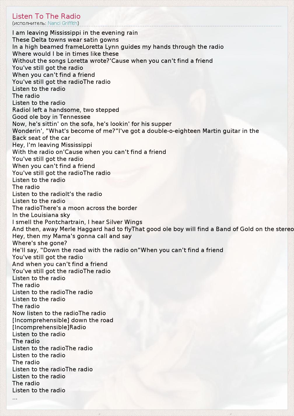 I am leaving Mississippi in the evening rain These Delta towns wear satin gowns In a high beamed frameLoretta Lynn guides my hands through the radio Where would I be in times like these Without the songs Loretta wrote?'Cause when you can't find a friend You've still got the radio When you can't find a friend You've still got the radioThe radio Listen to the radio The radio Listen to the radio RadioI left a handsome, two stepped Good ole boy in Tennessee Now, he's sittin' on the sofa, he's lookin' for his supper Wonderin', "What's become of me?"I've got a double-o-eighteen Martin guitar in the Back seat of the car Hey, I'm leaving Mississippi With the radio on'Cause when you can't find a friend You've still got the radio When you can't find a friend You've still got the radioThe radio Listen to the radio The radio Listen to the radioIt's the radio Listen to the radio The radioThere's a moon across the border In the Louisiana sky I smell the Pontchartrain, I hear Silver Wings And then, away Merle Haggard had to flyThat good ole boy will find a Band of Gold on the stereo Hey, then my Mama's gonna call and say Where's she gone? He'll say, "Down the road with the radio on"When you can't find a friend You've still got the radio And when you can't find a friend You've still got the radioThe radio Listen to the radio The radio Listen to the radioThe radio Listen to the radio The radio Now listen to the radioThe radio [Incomprehensible] down the road [Incomprehensible]Radio Listen to the radio The radio Listen to the radioThe radio Listen to the radio The radio Listen to the radioThe radio Listen to the radio The radio Listen to the radio ...