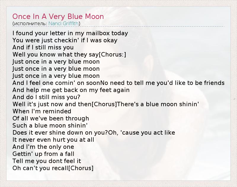 I found your letter in my mailbox today You were just checkin' if I was okay And if I still miss you Well you know what they say[Chorus:] Just once in a very blue moon Just once in a very blue moon Just once in a very blue moon And I feel one comin' on soonNo need to tell me you'd like to be friends And help me get back on my feet again And do I still miss you? Well it's just now and then[Chorus]There's a blue moon shinin' When I'm reminded Of all we've been through Such a blue moon shinin' Does it ever shine down on you?Oh, 'cause you act like It never even hurt you at all And I'm the only one Gettin' up from a fall Tell me you dont feel it Oh can't you recall[Chorus]