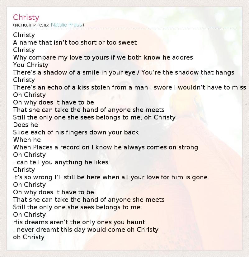 Christy A name that isn't too short or too sweet Christy Why compare my love to yours if we both know he adores You Christy There's a shadow of a smile in your eye / You're the shadow that hangs Christy There's an echo of a kiss stolen from a man I swore I wouldn't have to miss Oh Christy Oh why does it have to be That she can take the hand of anyone she meets Still the only one she sees belongs to me, oh Christy Does he Slide each of his fingers down your back When he When Places a record on I know he always comes on strong Oh Christy I can tell you anything he likes Christy It's so wrong I'll still be here when all your love for him is gone Oh Christy Oh why does it have to be That she can take the hand of anyone she meets Still the only one she sees belongs to me Oh Christy His dreams aren't the only ones you haunt I never dreamt this day would come oh Christy oh Christy