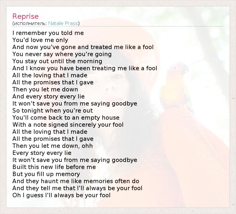 I remember you told me You'd love me only And now you've gone and treated me like a fool You never say where you're going You stay out until the morning And I know you have been treating me like a fool All the loving that I made All the promises that I gave Then you let me down And every story every lie It won't save you from me saying goodbye So tonight when you're out You'll come back to an empty house With a note signed sincerely your fool All the loving that I made All the promises that I gave Then you let me down, ohh Every story every lie It won't save you from me saying goodbye Built this new life before me But you fill up memory And they haunt me like memories often do And they tell me that I'll always be your fool Oh I guess I'll always be your fool