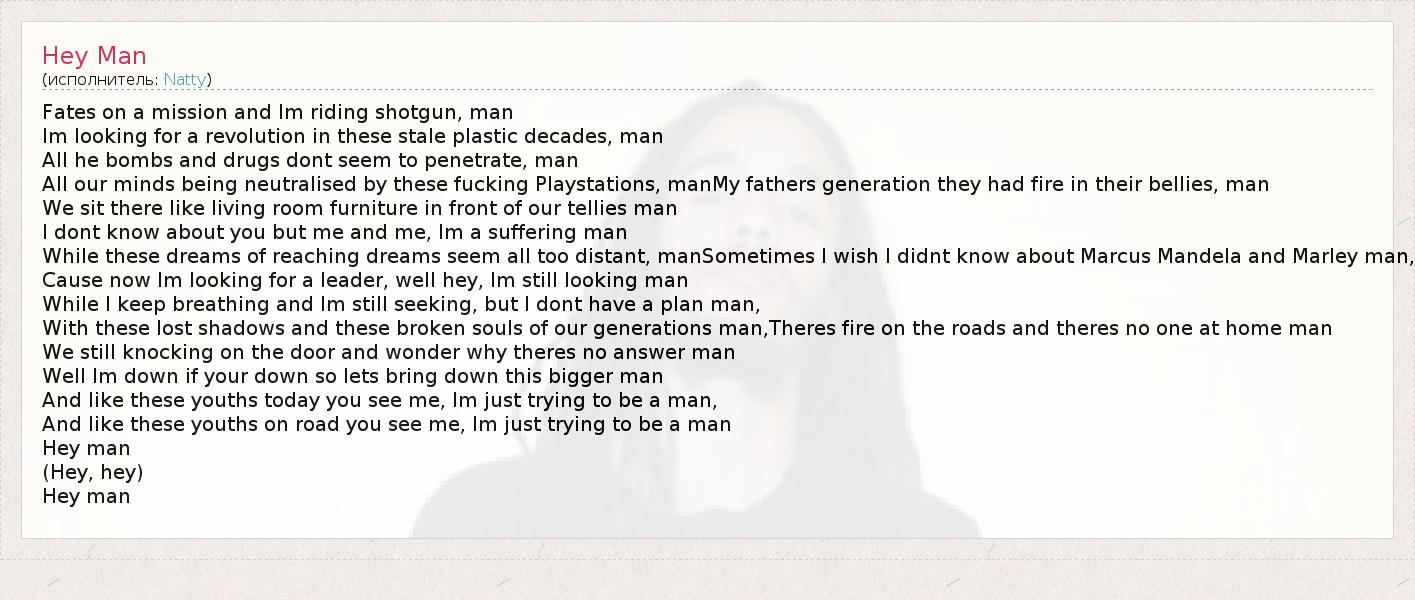 Fates on a mission and Im riding shotgun, man Im looking for a revolution in these stale plastic decades, man All he bombs and drugs dont seem to penetrate, man All our minds being neutralised by these fucking Playstations, manMy fathers generation they had fire in their bellies, man We sit there like living room furniture in front of our tellies man I dont know about you but me and me, Im a suffering man While these dreams of reaching dreams seem all too distant, manSometimes I wish I didnt know about Marcus Mandela and Marley man, Cause now Im looking for a leader, well hey, Im still looking man While I keep breathing and Im still seeking, but I dont have a plan man, With these lost shadows and these broken souls of our generations man,Theres fire on the roads and theres no one at home man We still knocking on the door and wonder why theres no answer man Well Im down if your down so lets bring down this bigger man And like these youths today you see me, Im just trying to be a man, And like these youths on road you see me, Im just trying to be a man Hey man (Hey, hey) Hey man