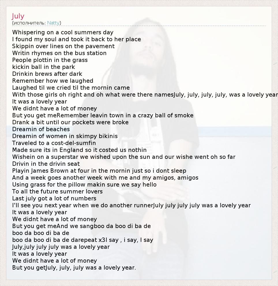 Whispering on a cool summers day I found my soul and took it back to her place Skippin over lines on the pavement Writin rhymes on the bus station People plottin in the grass kickin ball in the park Drinkin brews after dark Remember how we laughed Laughed til we cried til the mornin came With those girls oh right and oh what were there namesJuly, july, july, july, was a lovely year It was a lovely year We didnt have a lot of money But you get meRemember leavin town in a crazy ball of smoke Drank a bit until our pockets were broke Dreamin of beaches Dreamin of women in skimpy bikinis Traveled to a cost-del-sumfin Made sure its in England so it costed us nothin Wishein on a superstar we wished upon the sun and our wishe went oh so far Drivin in the drivin seat Playin James Brown at four in the mornin just so i dont sleep And a week goes another week with me and my amigos, amigos Using grass for the pillow makin sure we say hello To all the future summer lovers Last july got a lot of numbers I'll see you next year when we do another runnerJuly july july july was a lovely year It was a lovely year We didnt have a lot of money But you get meAnd we sangboo da boo di ba de boo da boo di ba de boo da boo di ba de darepeat x3I say , i say, I say July,july july july was a lovely year It was a lovely year We didnt have a lot of money But you getJuly, july, july was a lovely year.
