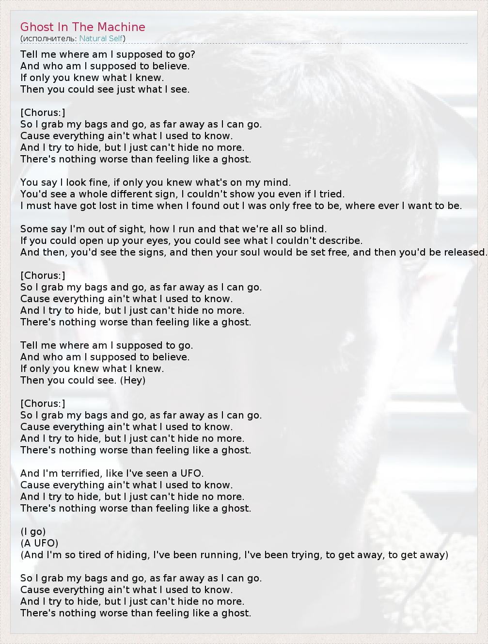 Скажи мне, куда я должен идти? И кому я могу верить? Если б ты только знала то, что знаю я. Тогда ты бы смогла увидеть то, что вижу я. Я хватаю свои сумки и ухожу как можно дальше от тебя, Потому что всё уже не такое, как я когда-то знал. И я пытаюсь спрятаться, но просто не могу больше прятаться. Нет ничего хуже ощущения, что ты призрак... Ты сказала что я отлично выгляжу. Если бы ты только знала, Что у меня на уме! Ты бы увидела совершенно новый знак, Который я не смог бы показать тебе, даже если бы попытался. Я, должно быть, потерялся во времени, когда узнал, Что я свободен быть там, где только пожелаю. Кто-то говорит, что я слишком быстро Исчез из виду и что мы оба слепы. Если бы ты только открыла глаза, Ты бы увидела то, чего я не могу описать. Ты бы увидела те знаки, и твоя душа вырвалась бы на свободу, И ты была бы свободна... Я хватаю свои сумки и ухожу как можно дальше от тебя, Потому что всё уже не такое, как я когда-то знал. И я пытаюсь спрятаться, но просто не могу больше прятаться. Нет ничего хуже ощущения, что ты призрак... Скажи мне, куда я должен идти? И кому я могу верить? Если б ты только знала то, что знаю я. Тогда ты бы смогла увидеть (Эй!) Я хватаю свои сумки и ухожу как можно дальше от тебя, Потому что всё уже не так, как было раньше. И я пытаюсь спрятаться, но просто не могу больше прятаться. Нет ничего хуже ощущения, что ты призрак... И я в ужасе, будто только что увидел НЛО, Потому что всё уже не такое, как я когда-то знал. И я пытаюсь спрятаться, но я не могу больше прятаться.. Нет ничего хуже, чемкогда ты чувствуешь себя как призрак.. (Я ухожу) (НЛО) (И я так устал прятаться, Я убегал, Я пытался... убежать подальше... убежать подальше) Я хватаю свои сумки и ухожу как можно дальше от тебя, Потому что всё уже не такое, как я когда-то знал. И я пытаюсь спрятаться, но просто не могу больше прятаться. Нет ничего хуже ощущения, что ты призрак...