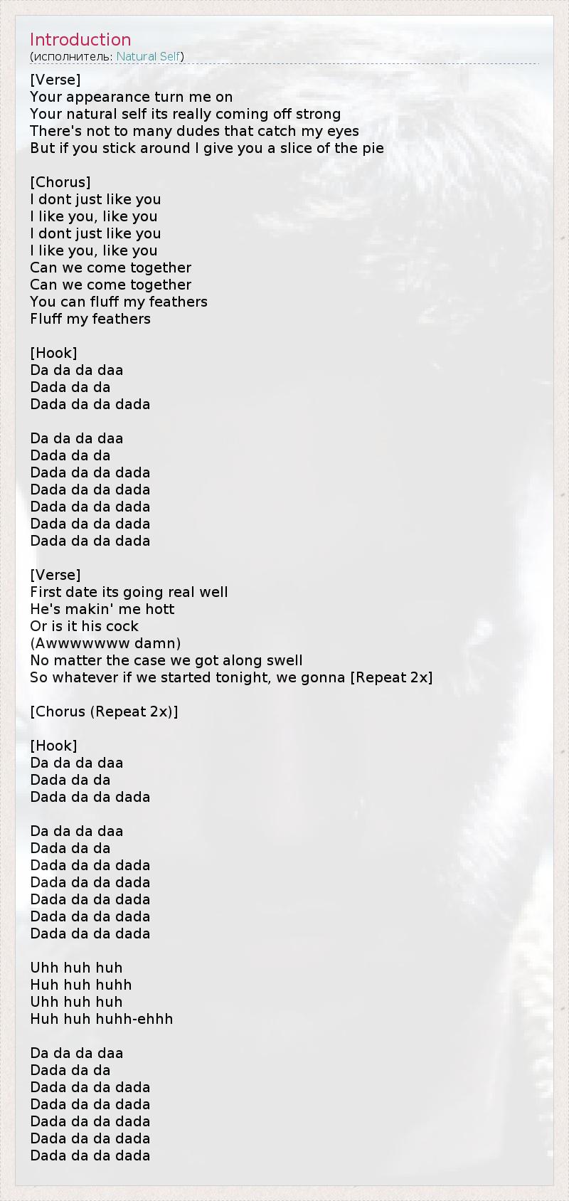[Verse] Your appearance turn me on Your natural self its really coming off strong There's not to many dudes that catch my eyes But if you stick around I give you a slice of the pie [Chorus] I dont just like you I like you, like you I dont just like you I like you, like you Can we come together Can we come together You can fluff my feathers Fluff my feathers [Hook] Da da da daa Dada da da Dada da da dada Da da da daa Dada da da Dada da da dada Dada da da dada Dada da da dada Dada da da dada Dada da da dada [Verse] First date its going real well He's makin' me hott Or is it his cock (Awwwwwww damn) No matter the case we got along swell So whatever if we started tonight, we gonna [Repeat 2x] [Chorus (Repeat 2x)] [Hook] Da da da daa Dada da da Dada da da dada Da da da daa Dada da da Dada da da dada Dada da da dada Dada da da dada Dada da da dada Dada da da dada Uhh huh huh Huh huh huhh Uhh huh huh Huh huh huhh-ehhh Da da da daa Dada da da Dada da da dada Dada da da dada Dada da da dada Dada da da dada Dada da da dada
