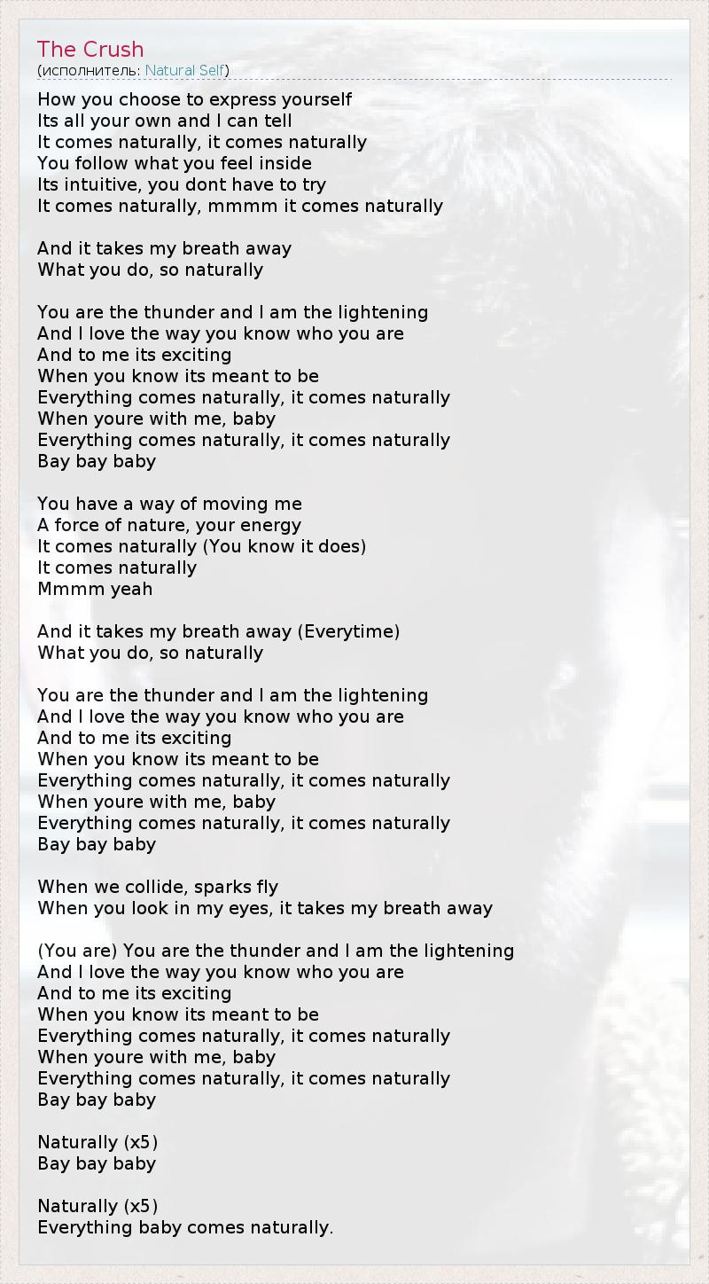 How you choose to express yourself Its all your own and I can tell It comes naturally, it comes naturally You follow what you feel inside Its intuitive, you dont have to try It comes naturally, mmmm it comes naturally And it takes my breath away What you do, so naturally You are the thunder and I am the lightening And I love the way you know who you are And to me its exciting When you know its meant to be Everything comes naturally, it comes naturally When youre with me, baby Everything comes naturally, it comes naturally Bay bay baby You have a way of moving me A force of nature, your energy It comes naturally (You know it does) It comes naturally Mmmm yeah And it takes my breath away (Everytime) What you do, so naturally You are the thunder and I am the lightening And I love the way you know who you are And to me its exciting When you know its meant to be Everything comes naturally, it comes naturally When youre with me, baby Everything comes naturally, it comes naturally Bay bay baby When we collide, sparks fly When you look in my eyes, it takes my breath away (You are) You are the thunder and I am the lightening And I love the way you know who you are And to me its exciting When you know its meant to be Everything comes naturally, it comes naturally When youre with me, baby Everything comes naturally, it comes naturally Bay bay baby Naturally (x5) Bay bay baby Naturally (x5) Everything baby comes naturally.