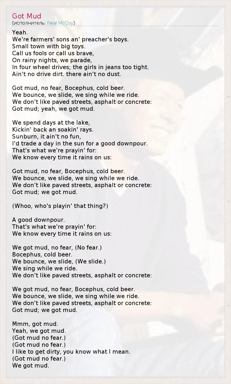 Yeah. We're farmers' sons an' preacher's boys. Small town with big toys. Call us fools or call us brave, On rainy nights, we parade, In four wheel drives; the girls in jeans too tight. Ain't no drive dirt. there ain't no dust. Got mud, no fear, Bocephus, cold beer. We bounce, we slide, we sing while we ride. We don't like paved streets, asphalt or concrete: Got mud; yeah, we got mud. We spend days at the lake, Kickin' back an soakin' rays. Sunburn, it ain't no fun, I'd trade a day in the sun for a good downpour. That's what we're prayin' for: We know every time it rains on us: Got mud, no fear, Bocephus, cold beer. We bounce, we slide, we sing while we ride. We don't like paved streets, asphalt or concrete: Got mud; we got mud. (Whoo, who's playin' that thing?) A good downpour. That's what we're prayin' for: We know every time it rains on us: We got mud, no fear, (No fear.) Bocephus, cold beer. We bounce, we slide, (We slide.) We sing while we ride. We don't like paved streets, asphalt or concrete: We got mud, no fear, Bocephus, cold beer. We bounce, we slide, we sing while we ride. We don't like paved streets, asphalt or concrete: Got mud; we got mud. Mmm, got mud. Yeah, we got mud. (Got mud no fear.) (Got mud no fear.) I like to get dirty, you know what I mean. (Got mud no fear.) We got mud.