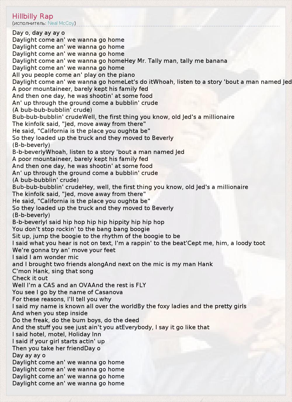 Daylight come an' we wanna go homeLet's do itWhoah, listen to a story 'bout a man named Jed