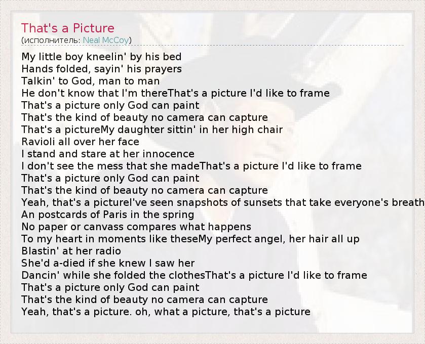 My little boy kneelin' by his bed Hands folded, sayin' his prayers Talkin' to God, man to man He don't know that I'm thereThat's a picture I'd like to frame That's a picture only God can paint That's the kind of beauty no camera can capture That's a pictureMy daughter sittin' in her high chair Ravioli all over her face I stand and stare at her innocence I don't see the mess that she madeThat's a picture I'd like to frame That's a picture only God can paint That's the kind of beauty no camera can capture Yeah, that's a pictureI've seen snapshots of sunsets that take everyone's breath An postcards of Paris in the spring No paper or canvass compares what happens To my heart in moments like theseMy perfect angel, her hair all up Blastin' at her radio She'd a-died if she knew I saw her Dancin' while she folded the clothesThat's a picture I'd like to frame That's a picture only God can paint That's the kind of beauty no camera can capture Yeah, that's a picture. oh, what a picture, that's a picture