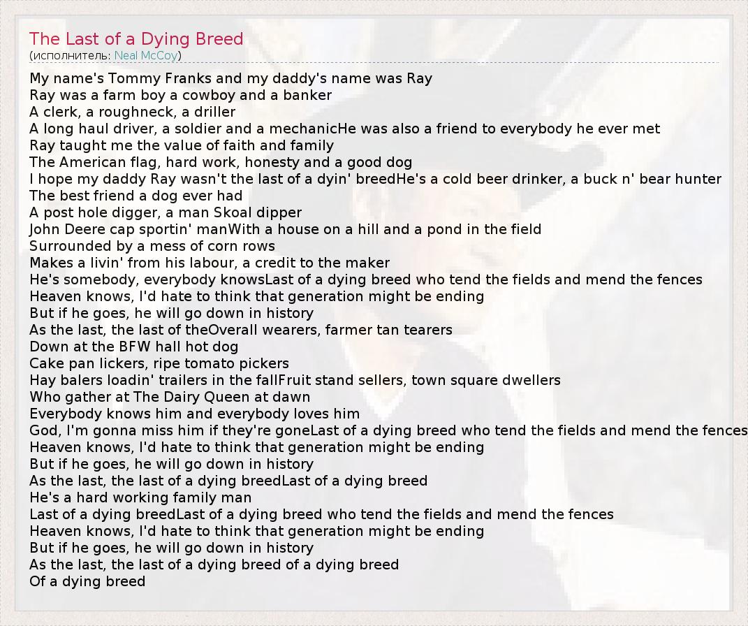 My name's Tommy Franks and my daddy's name was Ray Ray was a farm boy a cowboy and a banker A clerk, a roughneck, a driller A long haul driver, a soldier and a mechanicHe was also a friend to everybody he ever met Ray taught me the value of faith and family The American flag, hard work, honesty and a good dog I hope my daddy Ray wasn't the last of a dyin' breedHe's a cold beer drinker, a buck n' bear hunter The best friend a dog ever had A post hole digger, a man Skoal dipper John Deere cap sportin' manWith a house on a hill and a pond in the field Surrounded by a mess of corn rows Makes a livin' from his labour, a credit to the maker He's somebody, everybody knowsLast of a dying breed who tend the fields and mend the fences Heaven knows, I'd hate to think that generation might be ending But if he goes, he will go down in history As the last, the last of theOverall wearers, farmer tan tearers Down at the BFW hall hot dog Cake pan lickers, ripe tomato pickers Hay balers loadin' trailers in the fallFruit stand sellers, town square dwellers Who gather at The Dairy Queen at dawn Everybody knows him and everybody loves him God, I'm gonna miss him if they're goneLast of a dying breed who tend the fields and mend the fences Heaven knows, I'd hate to think that generation might be ending But if he goes, he will go down in history As the last, the last of a dying breedLast of a dying breed He's a hard working family man Last of a dying breedLast of a dying breed who tend the fields and mend the fences Heaven knows, I'd hate to think that generation might be ending But if he goes, he will go down in history As the last, the last of a dying breed of a dying breed Of a dying breed