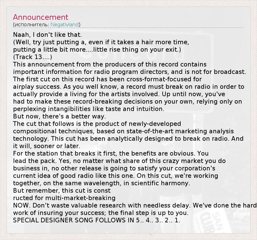 Это интересно:Negativland родом из Калифорнии. Являются одними из лидеров музыкального направления "sound collage" (или ещё называют "sampling"). Текущий состав: Марк Хаслер (Mark Hosler), Ричард Лайнс (Richard Lyons), Дон Джус (Don Joyce), Дэвид Уиллс (David Wills) и Питер Когейм (Peter Conheim). Negativland образовалась в 1979 году. Название решили взять по одноимённой песне группы Neu!. Лайнс и Хаслер были на тот момент в старшей школе.... продолжение