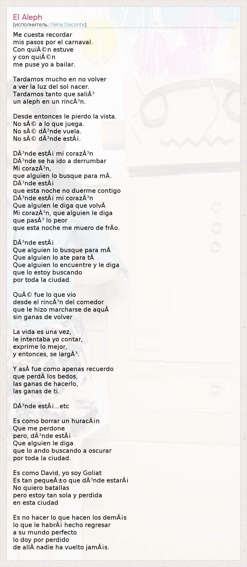 Это интересно:Nena Daconte - испанский дуэт, сформированный в 2005 году певицей и мадридским композитором Mai Meneses (конкурсантка Operación Triunfo 2) и барселонского музыканта Kim Fanlo. Их музыка это смесь попсы и классического рока и в своих песнях они говорят о любви, одиночестве и о поиске идеалов. Их первый альбом «He Perdido Los Zapatos» (Universal, 2006) был очень успешным (более 400.000 проданных... продолжение