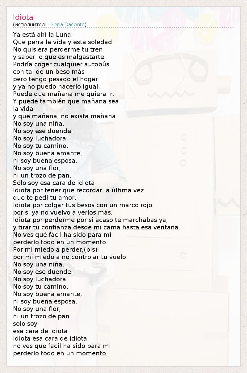 Я. está Ахи -ла-Луна . Que Perra La Vida у ЭСТА Соледад . Нет quisiera perderme Ту трен у сабля вот Que эс malgastarte . Podría coger cualquier autobús кон Таль де ООН Бесо más Перо Тенго Pesado эль Hogar у Я. не Puedo hacerlo Igual . Puede Que mañana мне quiera ИК . Y Puede también Que mañana море La Vida у Que mañana , не Exista mañana . Нет соевого Una Нина. Нет соевого ESE дуэнде . Нет соевого luchadora . Нет соевого Ту Camino. Нет соевого Буэна Amante , Ni соевый Буэна esposa . Нет соевого Una Flor , Ni ООН trozo де пан . Соло соевый ЕКА Кара -де- idiota Idiota POR Tener Que recordar ла Última Чавес Que те Педи Ту Amor . Idiota POR colgar ЕП Besos кон ООН Марко Рохо POR SI я не Vuelvoverlos más . Idiota POR perderme POR SI acaso те marchabas я, у tirar Ту Confianza Цена от MI Кама Hasta ЕКА Вентана . Нет VES qué Fácil га Sido пункт mí perderlo TODO EN Ун Моменто . Por миль MiedoPerder ( бис ) POR MI не Miedoне controlar Ту Vuelo . Нет соевого Una Нина. Нет соевого ESE дуэнде . Нет соевого luchadora . Нет соевого Ту Camino. Нет соевого Буэна Amante , Ni соевый Буэна esposa . Нет соевого Una Flor , Ni ООН trozo де пан . соло сои ЕКА Кара -де- idiota idiota ЕКА Кара -де- idiota Нет VES Que Facil га Sido пункт мили perderlo TODO EN Ун Моменто .