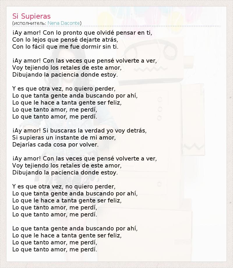 ¡ Ay Amor ! Con вот промедления Que olvidé Pensar Эн Ти , Con вот Lejos Que Pense dejarte Atras , Con ло FACIL Que мне ФРУ Dormir Sin Ti . ¡ Ay Amor ! Con -лас- VECES Que Pense volverteверсии , Voy tejiendo Los retales де Эсте Амор, Dibujando ла Paciencia Donde Estoy . Y ES Que Otra Чавес , не Quiero Perder , Lo Que Танта Gente Anda Вы ищете Ахи , Lo Que ле HACEТанта Gente сер Feliz , Lo Que танто Амор, мне perdí , Lo Que танто Амор, мне perdí . ¡ Ay Amor ! Si buscaras ла Verdad лет Voy detrás , Si supieras ООН instante де Mi Amor , Dejarías Када Коза POR Volver . ¡ Ay Amor ! Con -лас- VECES Que Pense volverteверсии , Voy tejiendo Los retales де Эсте Амор, Dibujando ла Paciencia Donde Estoy . Y ES Que Otra Чавес , не Quiero Perder , Lo Que Танта Gente Anda Вы ищете Ахи , Lo Que ле HACEТанта Gente сер Feliz , Lo Que танто Амор, мне perdí , Lo Que танто Амор, мне perdí . Lo Que Танта Gente Anda Вы ищете Ахи , Lo Que ле HACEТанта Gente сер Feliz , Lo Que танто Амор, мне perdí , Lo Que танто Амор, мне perdí .