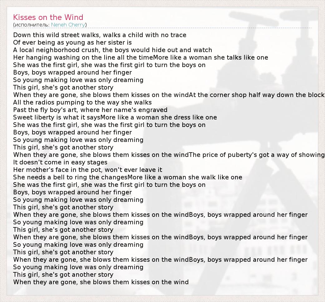 А как ты думаешь, о чем песня "Kisses on the Wind" ?