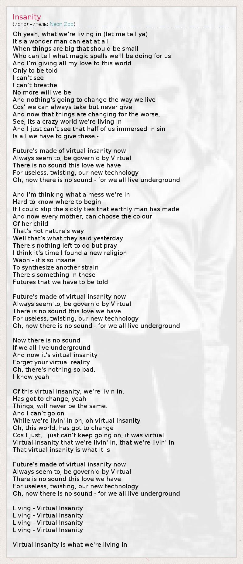 О, да, как мы живем (дай-ка я расскажу тебе, да), Это – чудо, вообще, человек может есть! Нас окружают большие вещи, которые могли бы быть маленькими. Кто знает, какие магические заклинания мы будем использовать для нас! Я отдаю всю свою любовь этому миру. Только представь: Я не могу видеть, Я не могу дышать, Нас больше нет, И ничто не изменит наш способ жизни, Потому что мы можем только брать, но не отдавать. И сейчас, когда все меняется к худшему, Смотри, это безумие – мир, в котором мы живем. И я просто не могу наблюдать затем, как половина из нас погрязла в грехах, И все, что мы должны отдать, - это... Будущее, состоящее из виртуального безумия. Такое ощущение, что нами управляет только виртуальное, А наша любовь даже не подаёт голоса... Наши новые технологии – бесполезные и мудреные, О, ни звука - мы все живем в подполье... И я думаю, в какой же кутерьме мы живем, Трудно понять, где же начало. Если б я мог порвать нездоровые путы, которыми опутал себя человек! Сейчас каждая мать, может выбрать цвет Своего ребенка. Но это неестественно! Прикинь, вчера они сказали, Ничего нельзя сделать, остается только молиться! Думаю, сейчас самое время найти новую религию. Вау - это настолько безумно! Синтезировать других людей, И всё-таки есть что-то в этом Будущем, о котором нам должен кто-то рассказать... Будущее, состоящее из виртуального безумия. Такое ощущение, что нами управляет только виртуальное, А наша любовь даже не подаёт голоса... Наши новые технологии – бесполезные и мудреные, О, ни звука - мы все живем в подполье... До нас не доходит ни звука, Если мы живем в подполье. Это - виртуальное безумие. Забудь свою виртуальную реальность, О, это не так уж и плохо, Я знаю, да.... ...Об этом виртуальном безумии, в которм мы живем. Что-то должно измениться, да. Уже никогда не будет, как было, И я не могу так больше, Пока мы живем в виртуальном безумии. О, этот мир должен измениться, Потому что я просто, я просто не могу так больше, это все виртуально. Виртуальное безумие – вот как мы живем, вот как мы живем, Виртуальное безумие – вот как это называется... Будущее, состоящее из виртуального безумия. Такое ощущение, что нами управляет только виртуальное, А наша любовь даже не подаёт голоса... Наши новые технологии – бесполезные и мудреные, О, ни звука - мы все живем в подполье... Живем – Виртуальным Безумием Живем – Виртуальным Безумием Живем – Виртуальным Безумием Живем – Виртуальным Безумием Виртуальное Безумие - это то, в чем мы живем...